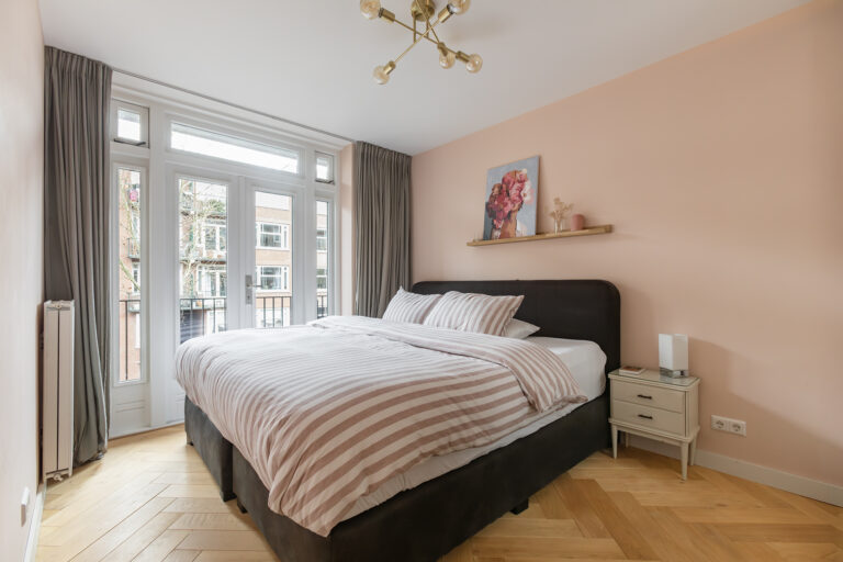 De slaapkamer heeft een grote raampartij en directe toegang tot het balkon met ochtendzon. Dankzij de flexibele opstelling van de kastenwand pas je de indeling eenvoudig aan jouw woonwensen aan. Meer slaapruimte of juist een grotere woonkamer, het kan hier allebei.