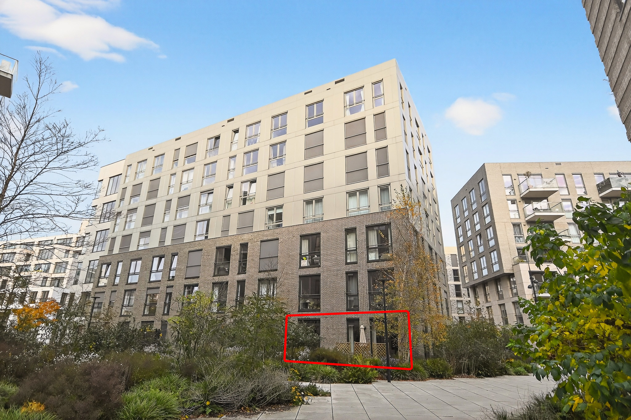 Positioned on a corner, the apartment benefits from large windows, creating a wonderfully bright living and dining area. The contemporary open-plan kitchen is fitted with modern built-in appliances. From the living space, you step directly onto the charming terrace (approx. 10 m²), overlooking the beautifully landscaped communal garden — a true bonus for city living.