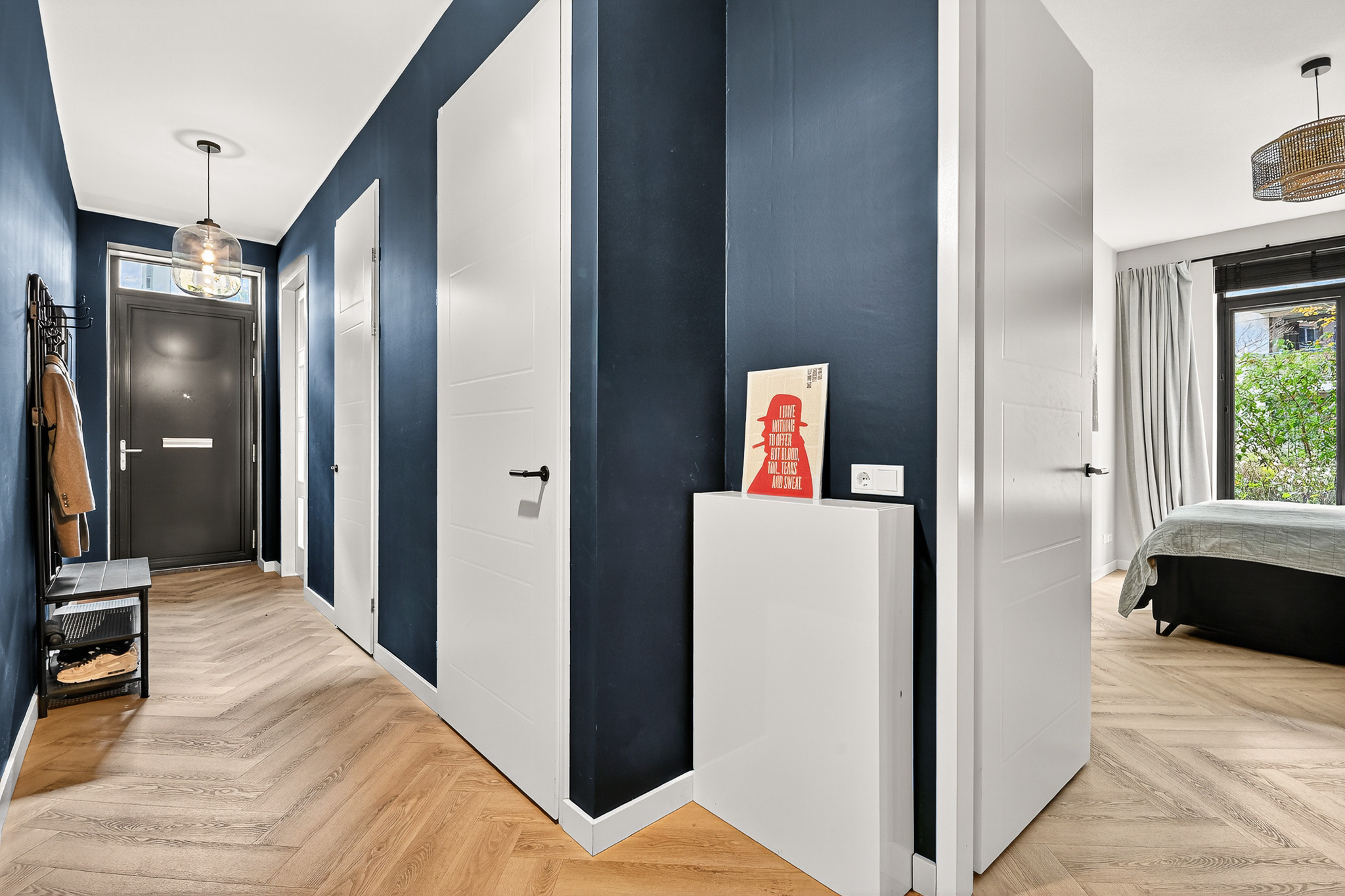 Private entrance leading into a spacious hallway providing access to all rooms.