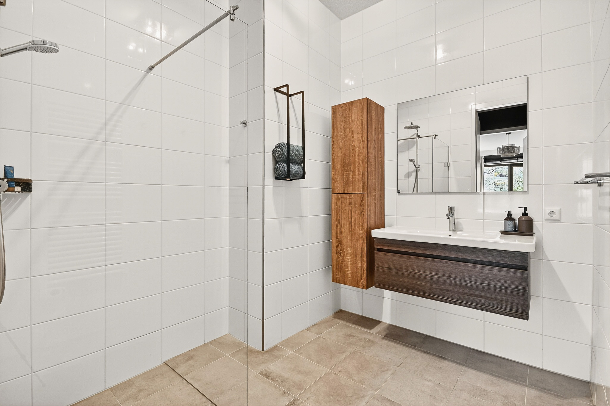 De moderne badkamer is voorzien van een wastafelmeubel en een ruime inloopdouche. Het toilet is separaat.
