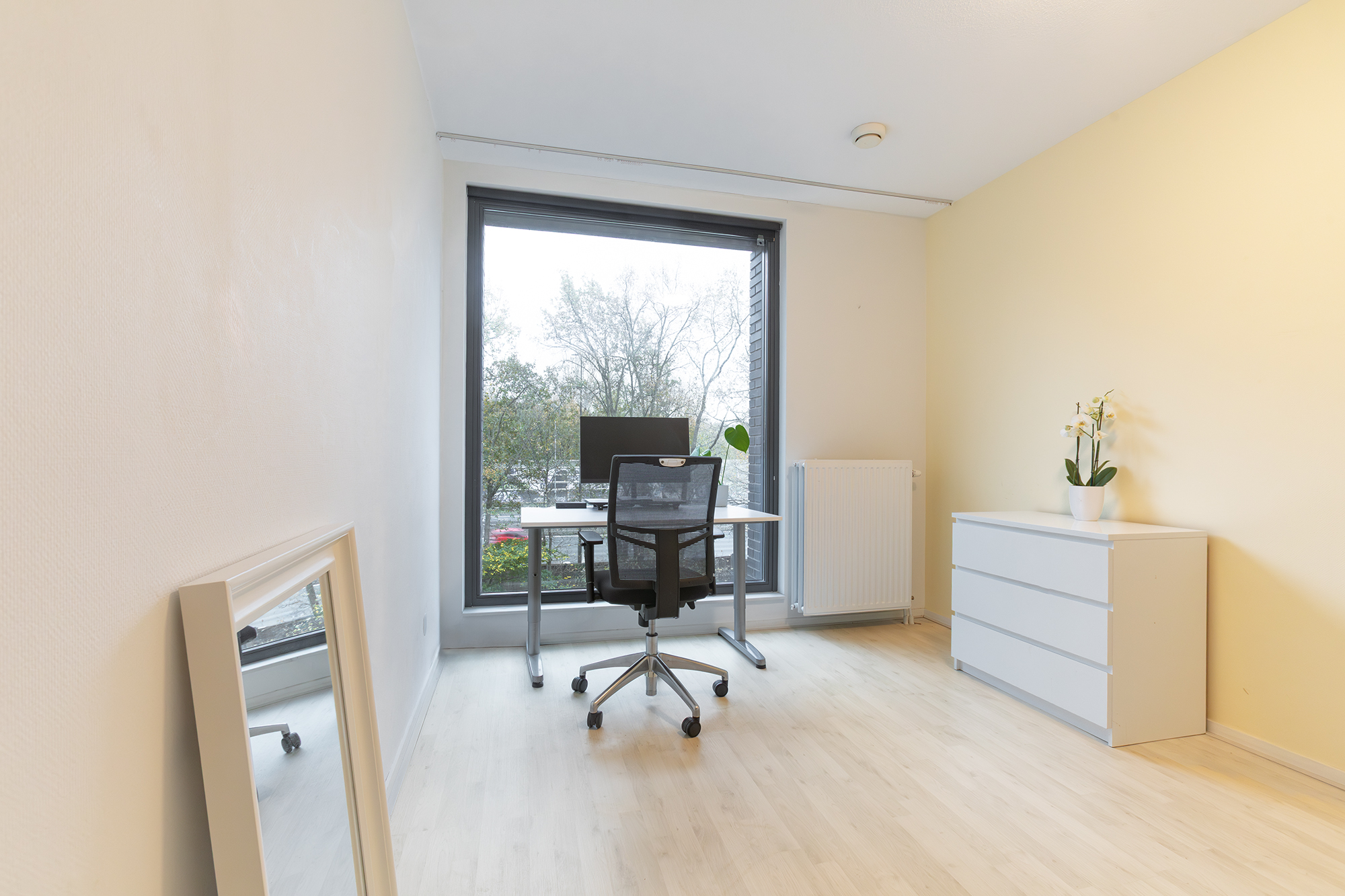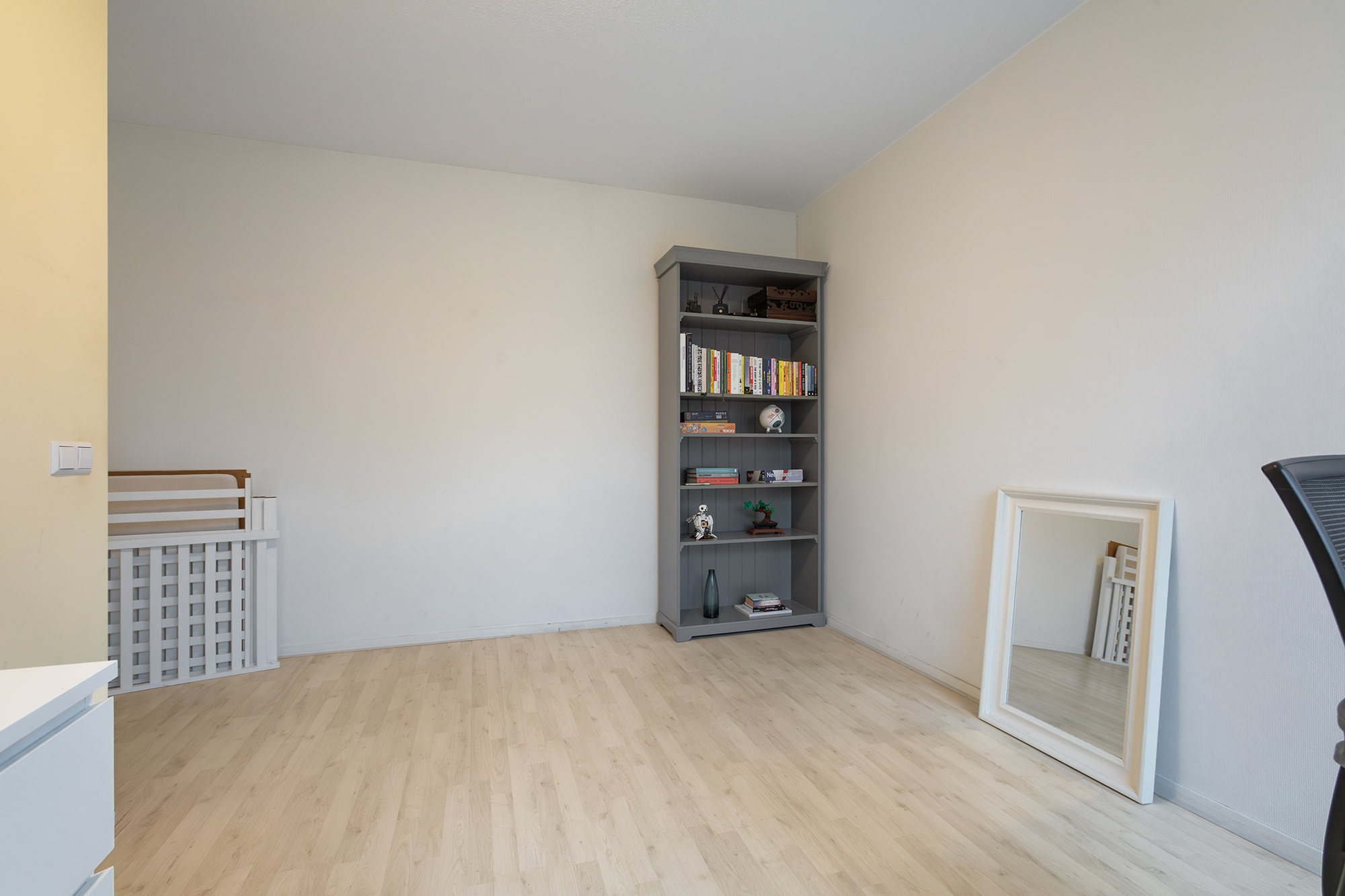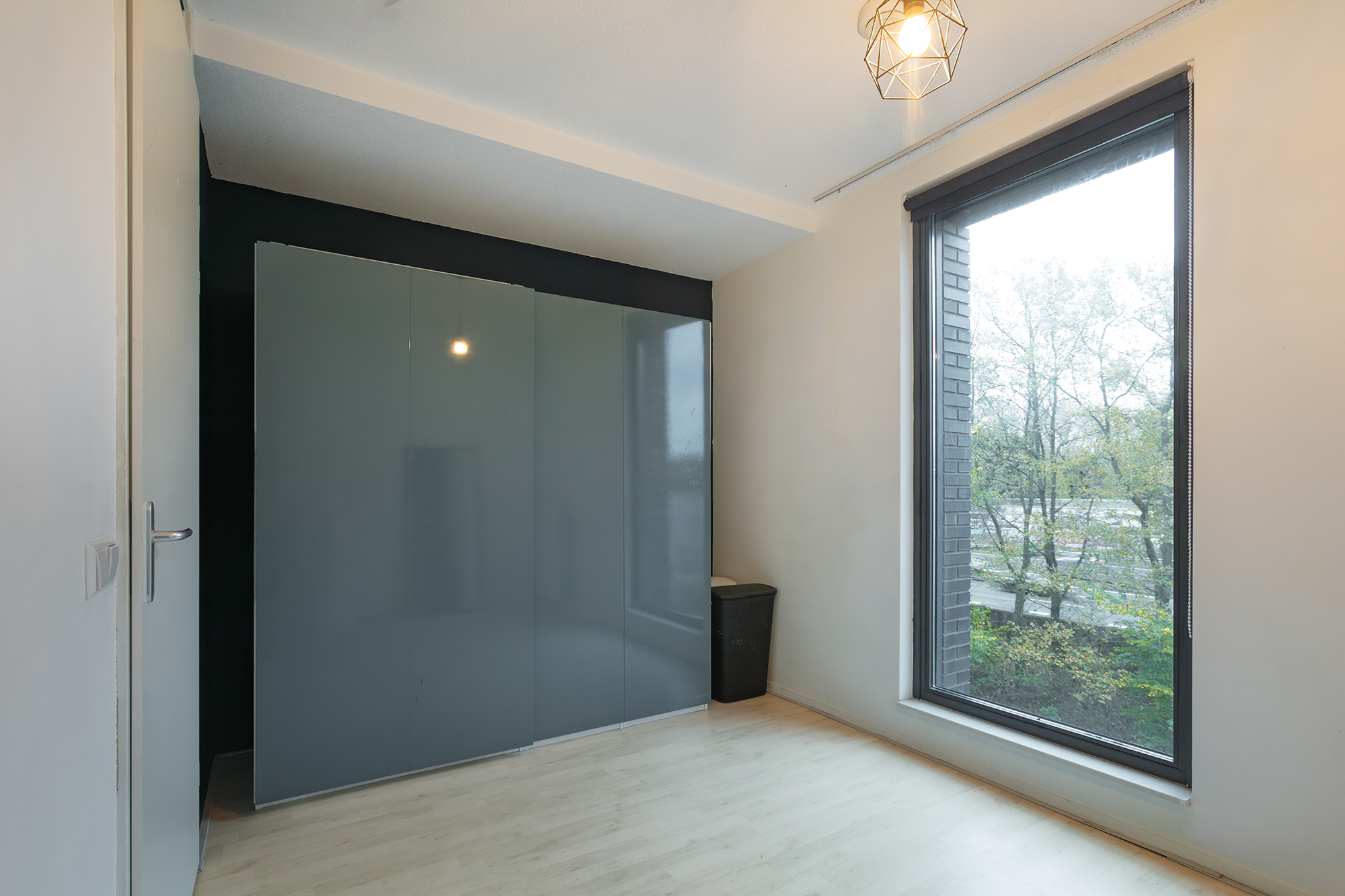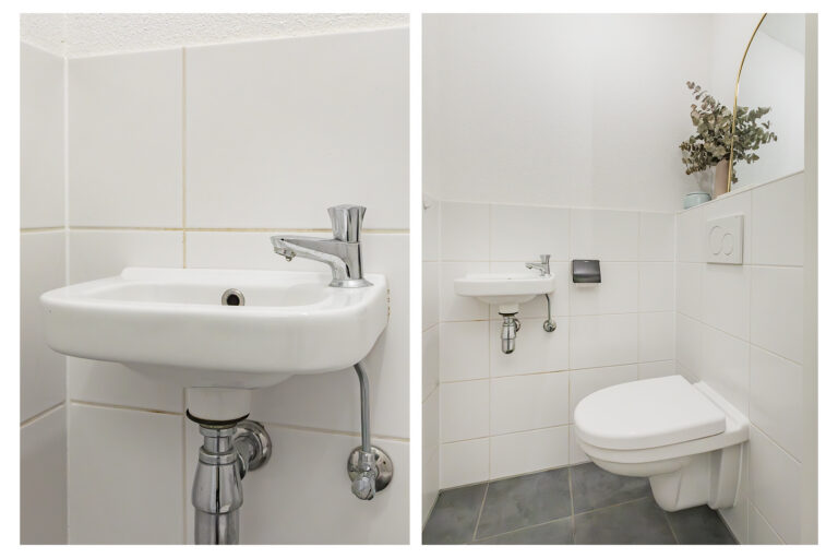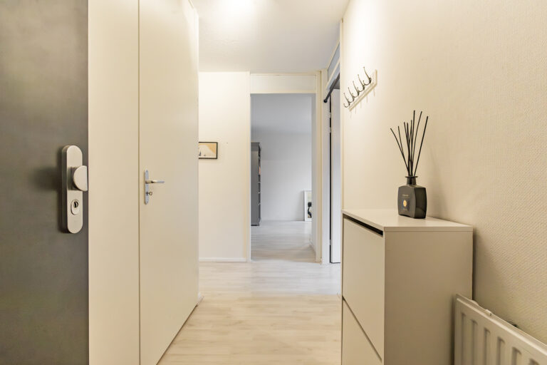 Verder zijn er drie slaapkamers: één grote aan de voorzijde met veel licht, en twee kamers aan de achterzijde, die door de grote ramen ook uitstekend als studeer- of werkruimte gebruikt kunnen worden. De badkamer is netjes en praktisch ingericht met een douche en wastafel. Het toilet is apart. Tot slot is er nog een interne bergkast met ruime plek voor de nevenopstelling van wasmachine en droger.