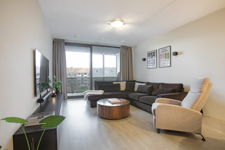 Je komt binnen in een ruime hal met toegang tot alle vertrekken. De rechthoekige woonkamer ligt aan de voorzijde en staat in open verbinding met de keuken. Dankzij de grote glazen schuifpui is de lichtinval hier opvallend prettig. Vanuit de woonkamer stap je zo het brede terras op — een fijne plek waar je vanaf de middag tot in de avond van de zon kunt genieten. Ook vanuit de grootste slaapkamer heb je toegang tot het terras.
