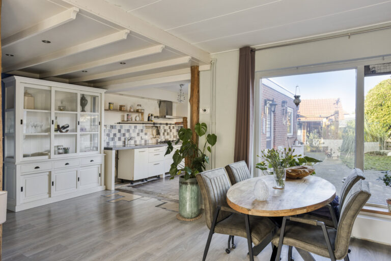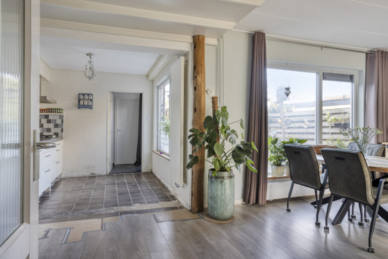 De woning is aan de achterzijde uitgebouwd, waar de keuken is gelegen. Door een eerdere lekkage is de keuken grotendeels gedemonteerd, maar dat biedt juist een unieke kans om hier een geheel nieuwe keuken naar eigen smaak te realiseren. Tussen de woonkamer en de keuken is voldoende ruimte voor een grote eettafel — dé plek waar je samenkomt, dineert en geniet.