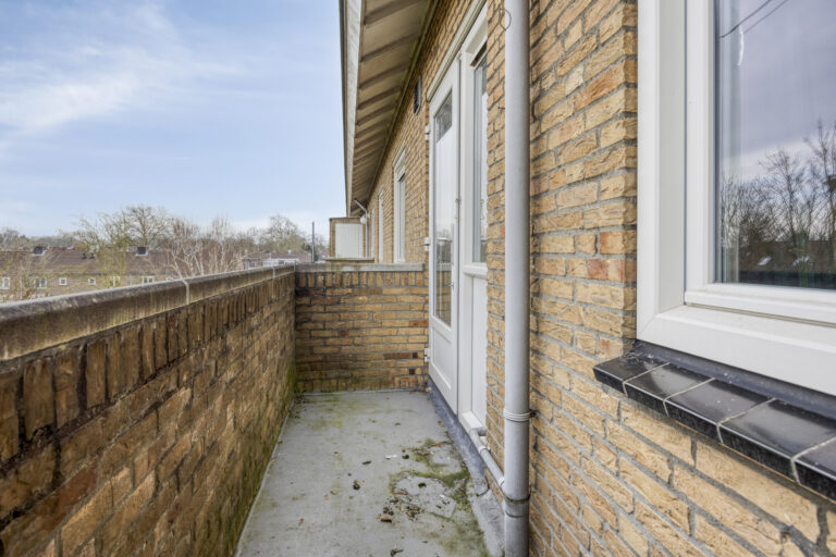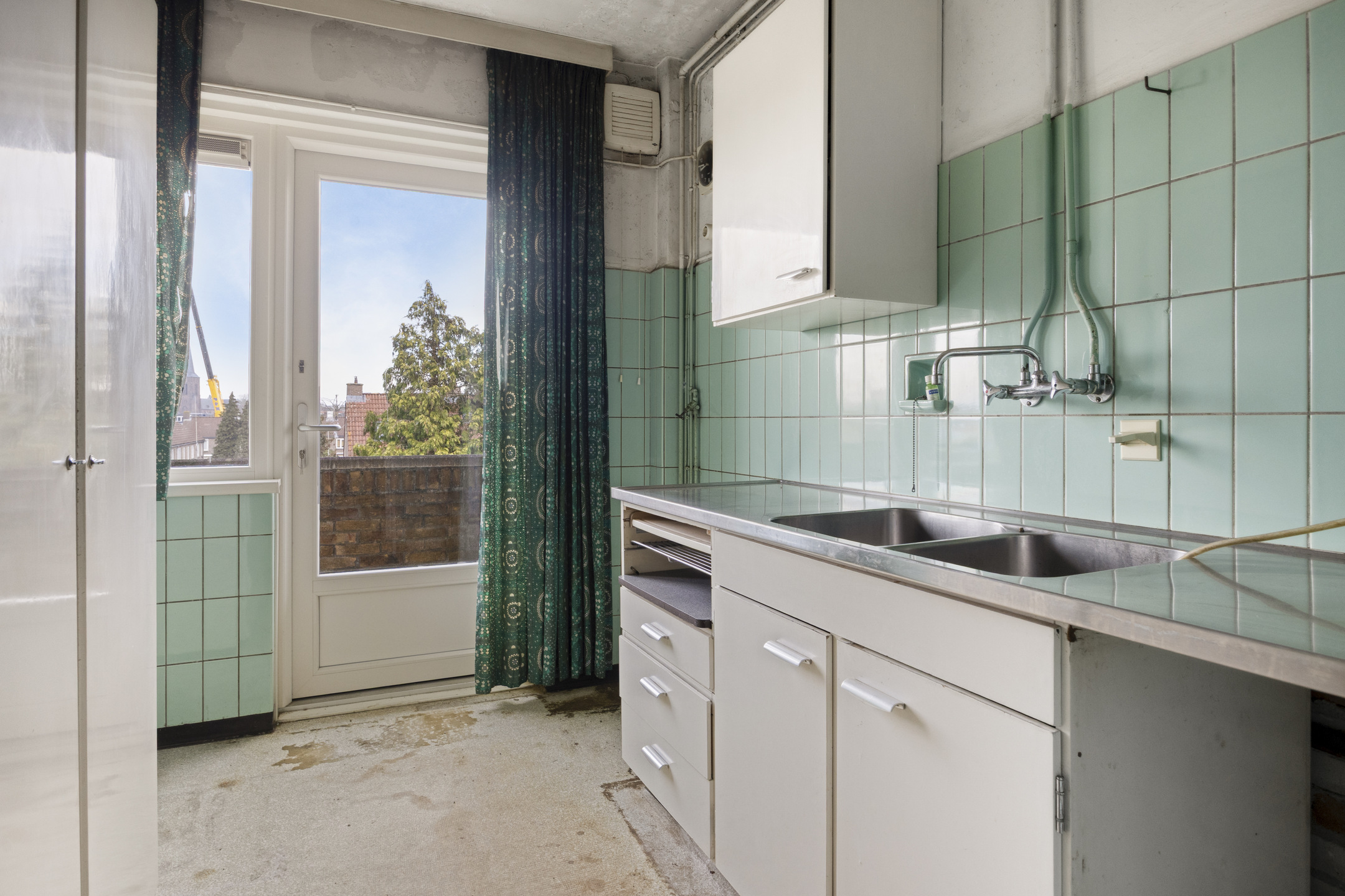 Aan de achterzijde bevinden zich twee rustig gelegen slaapkamers. Tussen beide kamers ligt de keuken, met toegang tot het tweede balkon waar u de dag begint met de ochtendzon. Verder beschikt het appartement over een badkamer en een separaat toilet. Het geheel vraagt om modernisatie, wat u de vrijheid geeft het appartement volledig naar eigen smaak in te richten.