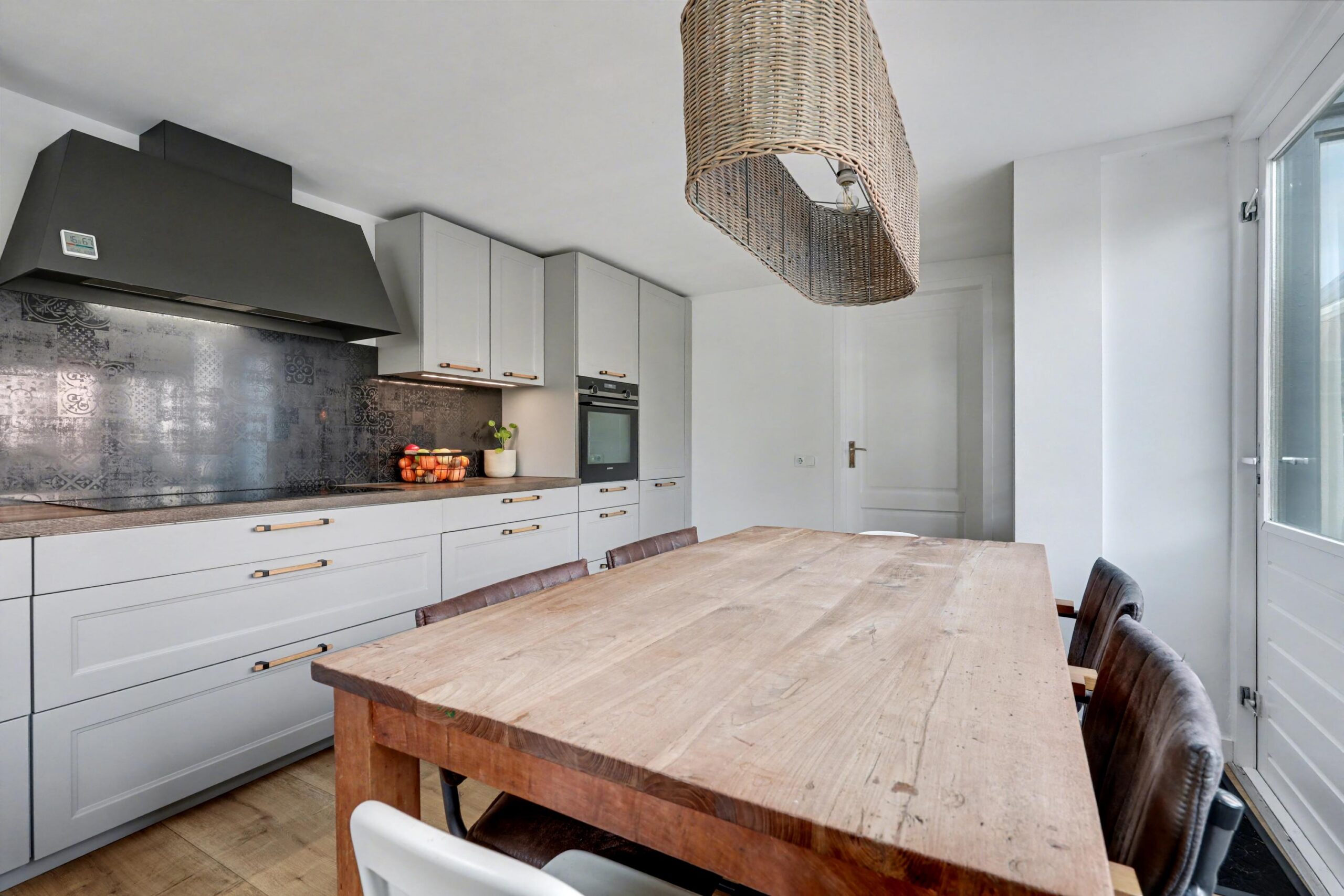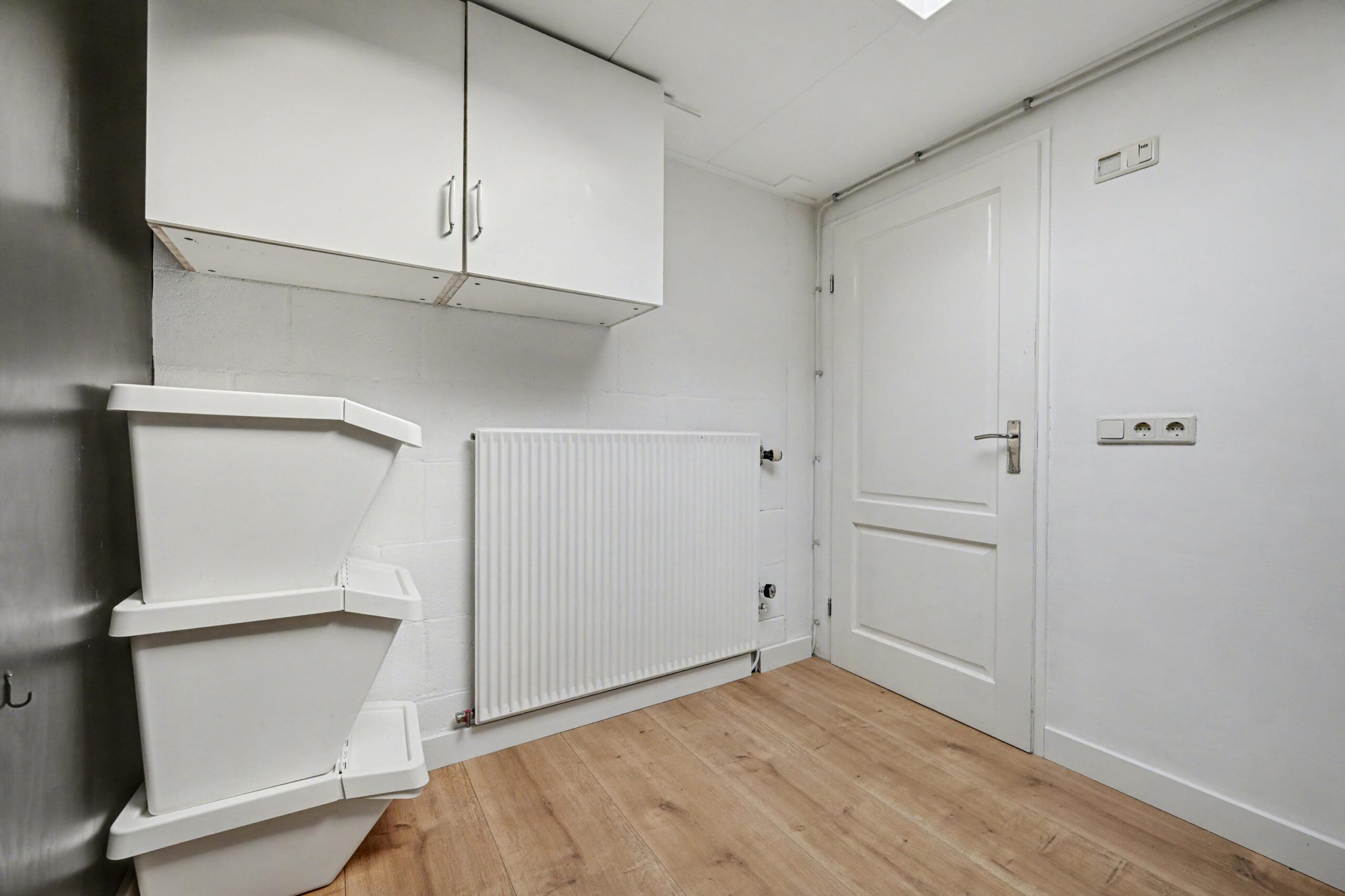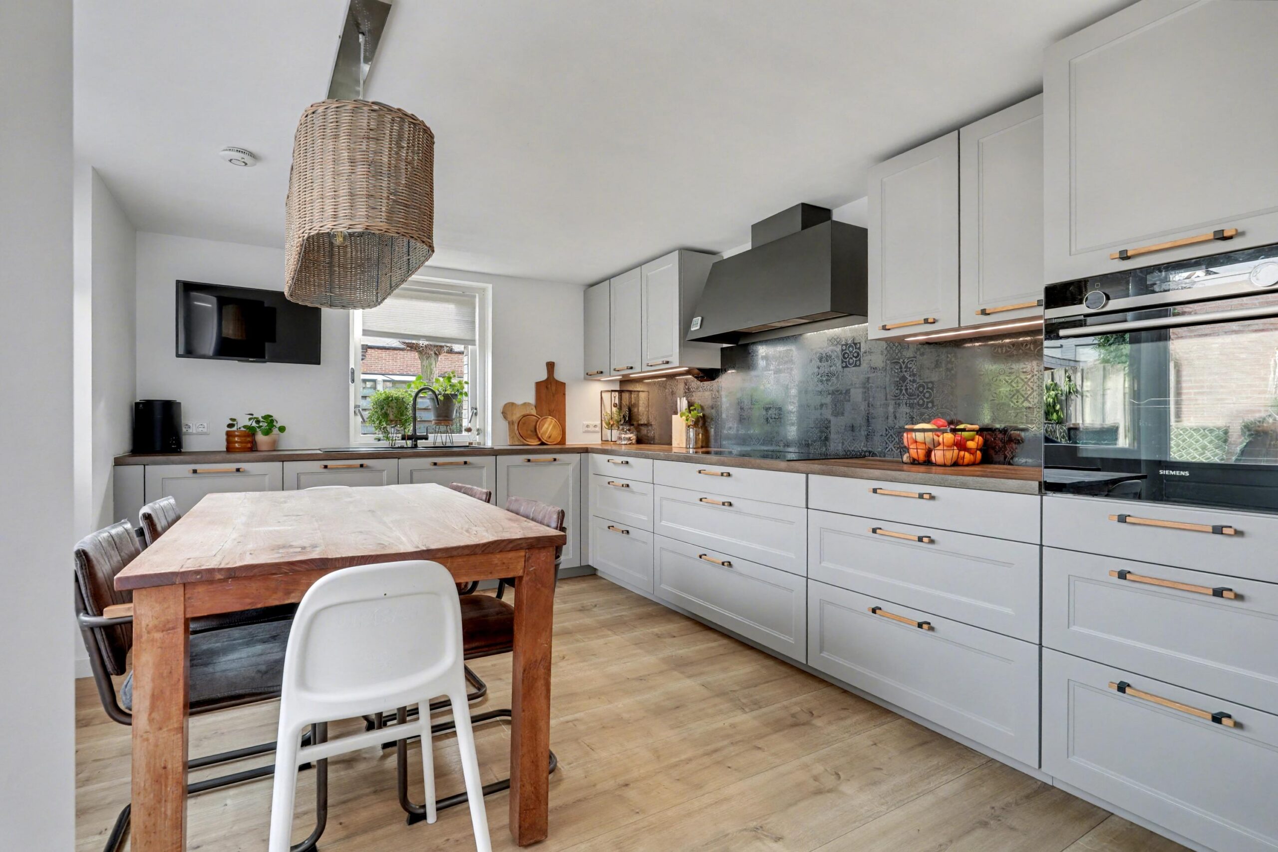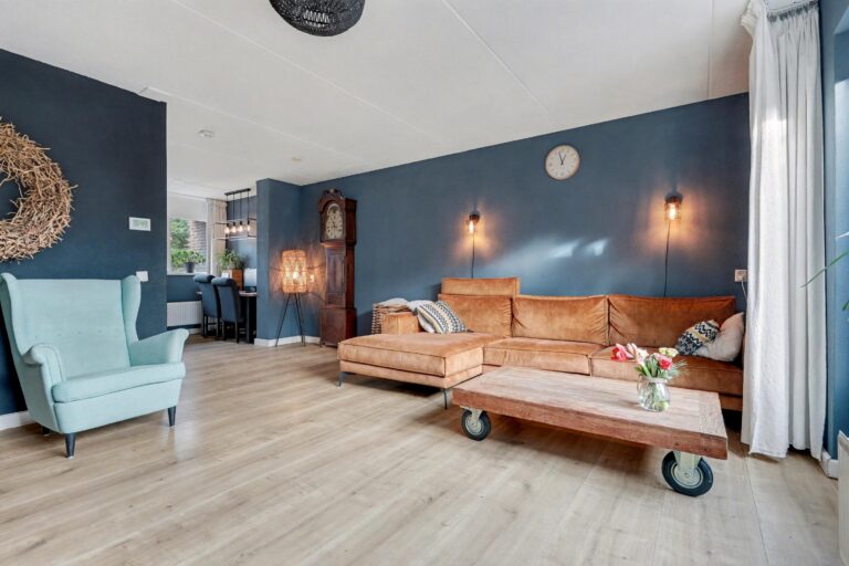 De woonkamer strekt zich uit over de gehele lengte van de woning en biedt een prettige, logische indeling met ruimte voor meerdere zithoeken of bijvoorbeeld een werkplek. Onder de trap bevindt zich nog een handige bergkast. Aan de achterzijde ligt de leefkeuken in de uitbouw, die fungeert als het centrale punt van de woning. Vanuit hier stap je direct de tuin in, wat zorgt voor een fijne verbinding tussen binnen en buiten. Vanuit de keuken is ook een handige wasruimte te bereiken. Een ideale ruimte voor elk huishouden!