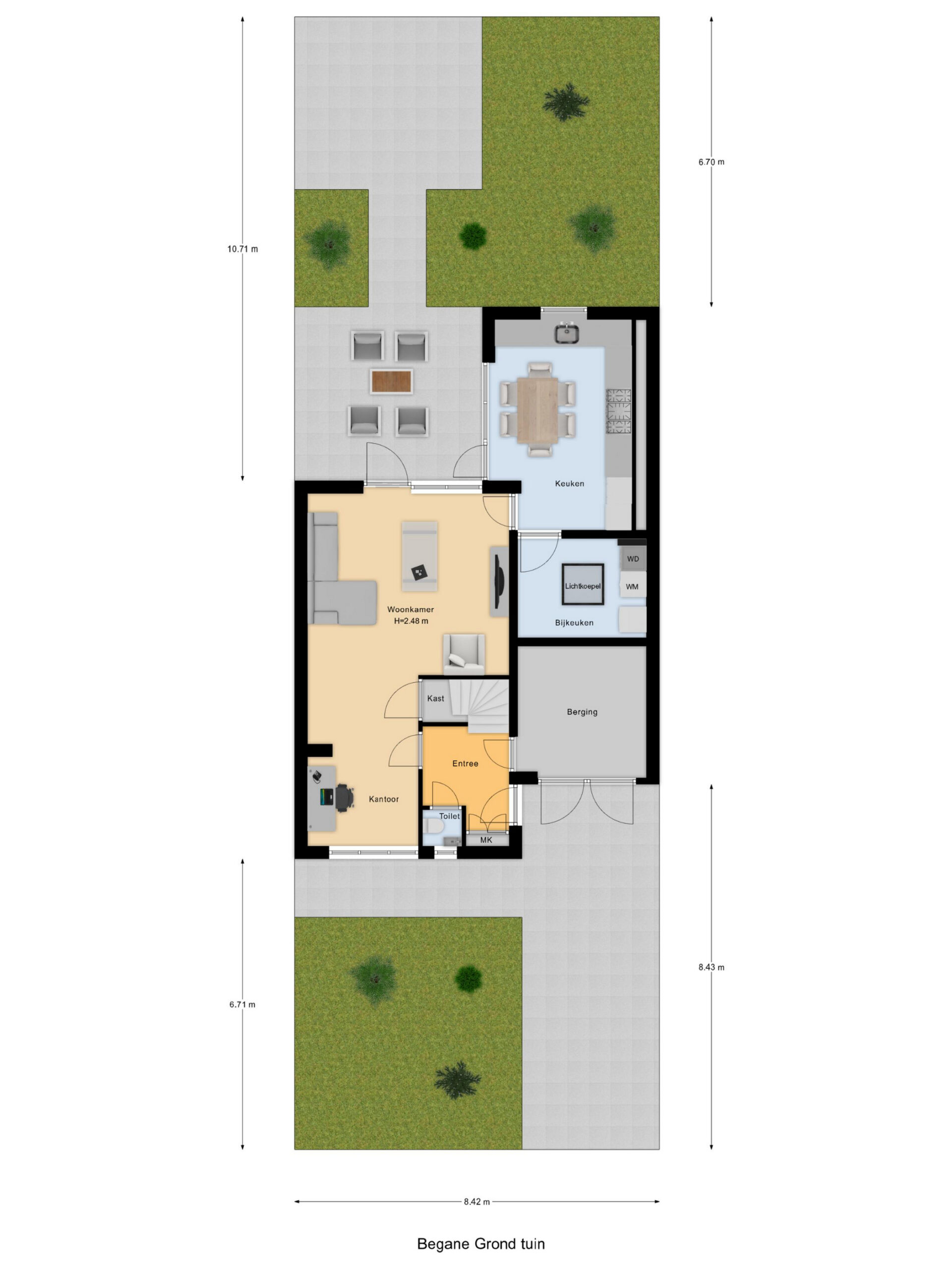 Je betreedt de woning via de entree aan de zijkant. In de hal vind je het toilet, de meterkast en de trapopgang naar de eerste verdieping. Vanuit de hal is ook de berging aan de voorzijde bereikbaar, voorzien van een dubbele deur naar de oprit; een praktische ruimte voor fietsen en opslag.