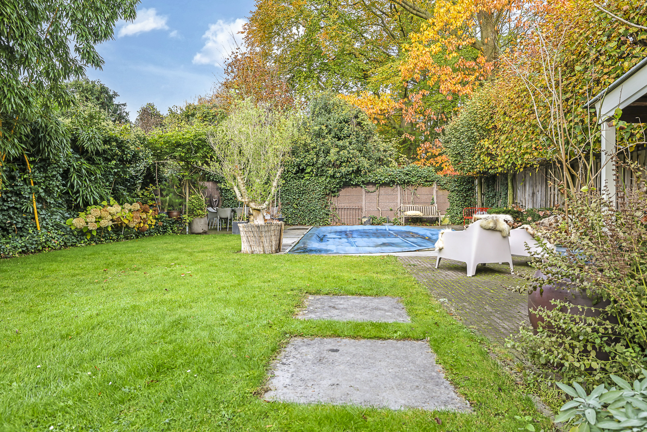 De achtertuin ligt op het noordwesten, biedt nagenoeg de gehele dag een zonplekje en is een oase van rust en privacy. Hier kun je het hele jaar door genieten: van lange zomeravonden aan het water van het buitenzwembad, ontspannen onder de overkapping, of rustig hobbyen in de stenen schuur. Naast de woning is een oprit met plek voor twee auto’s, waarvan één onder de carport. Deze is zo'n 4 jaar geleden geplaatst. Dankzij de royale hoogte past hier zelfs een caravan of kampeerbusje onder.