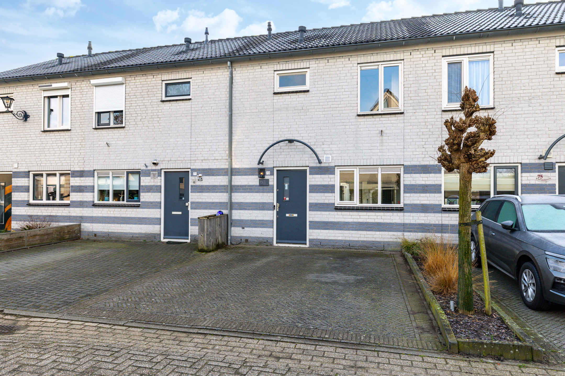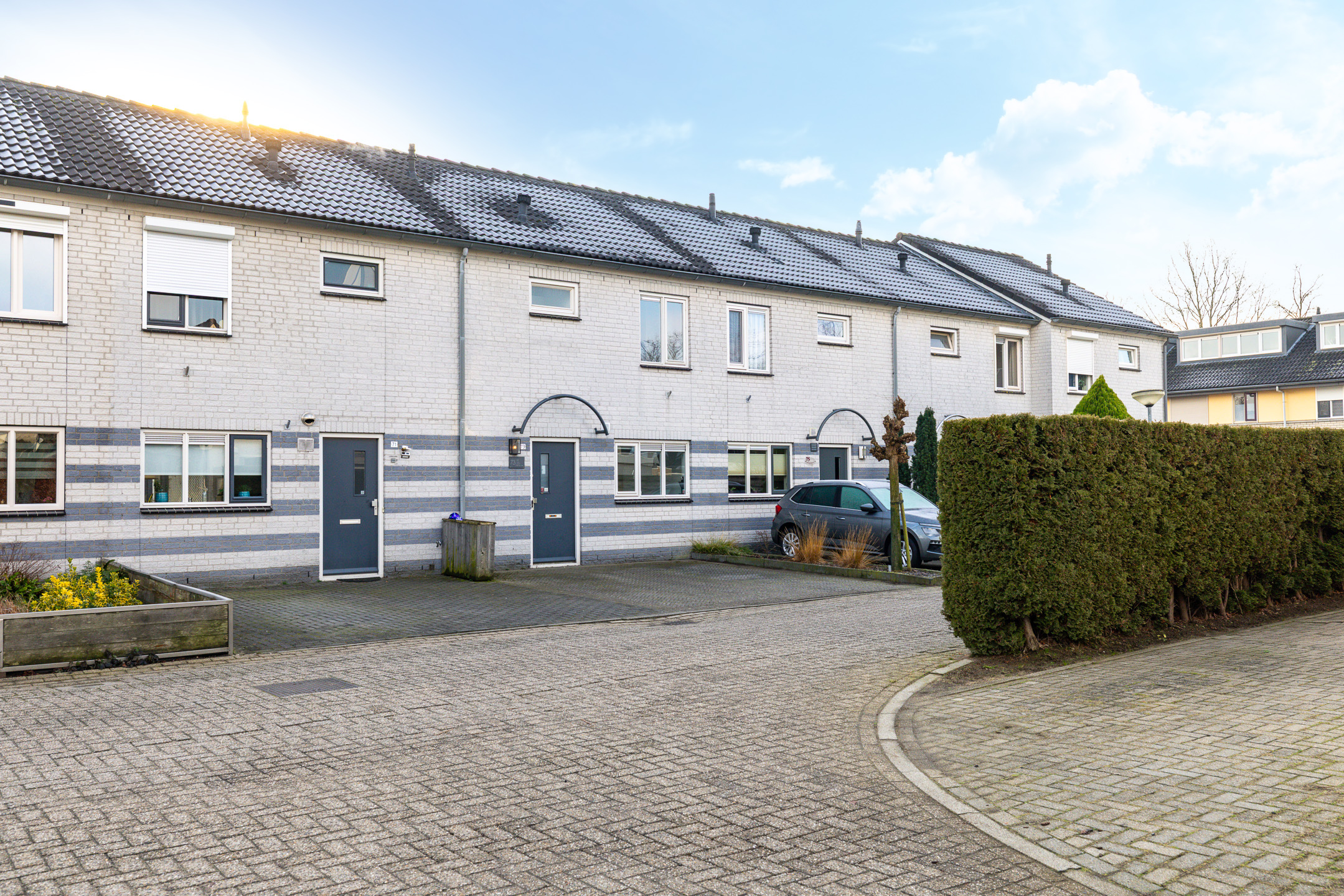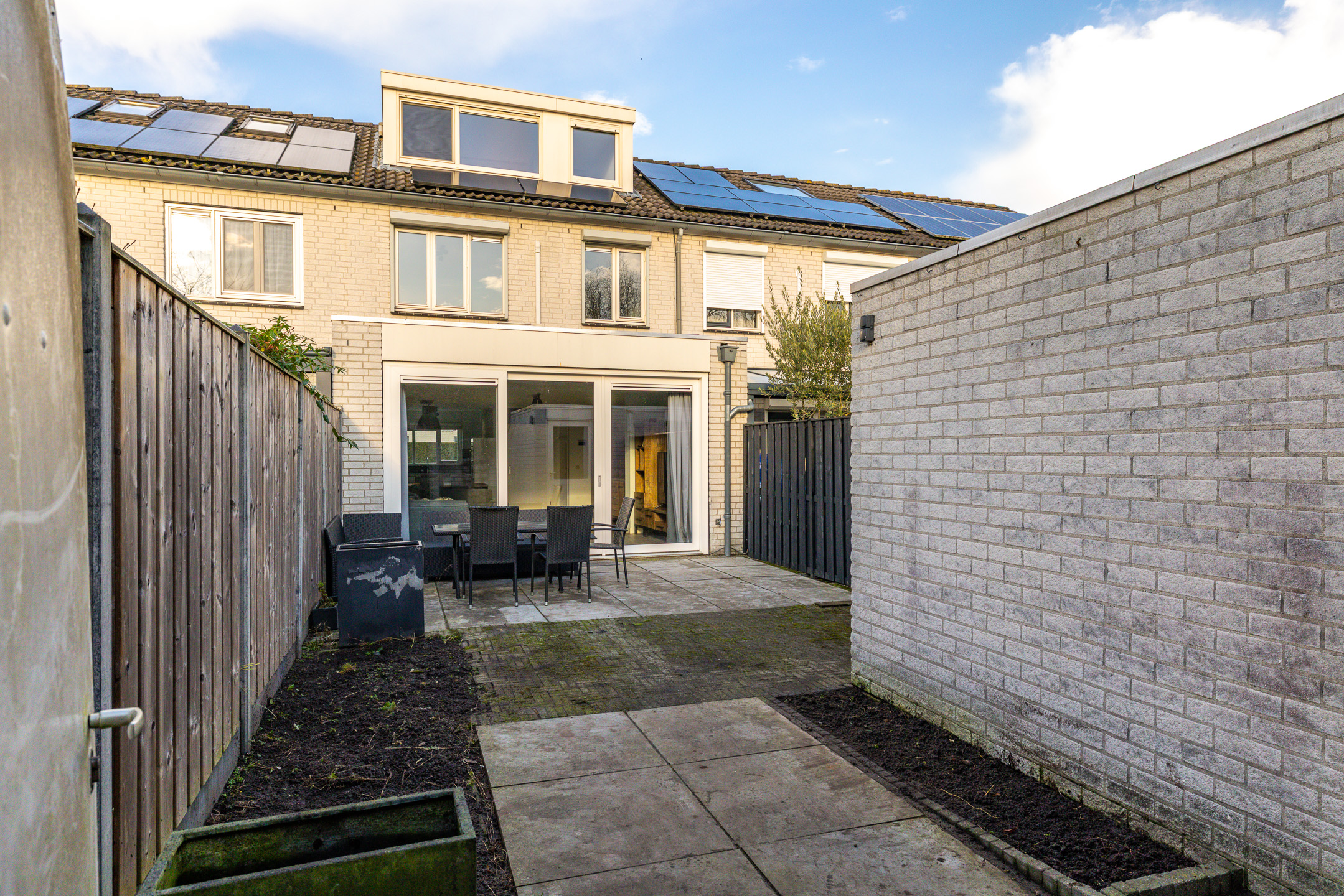 De zonnige achtertuin, gelegen op het zuidoosten, is circa 10 meter diep, volledig afgesloten en bereikbaar via een achterom. De stenen berging is geschikt voor fietsen en gereedschap; een extra schuurtje biedt ruimte voor containers. Aan de voorzijde van de woning is parkeergelegenheid voor twee auto’s op eigen terrein, met daarnaast voldoende openbare parkeerruimte in de straat.