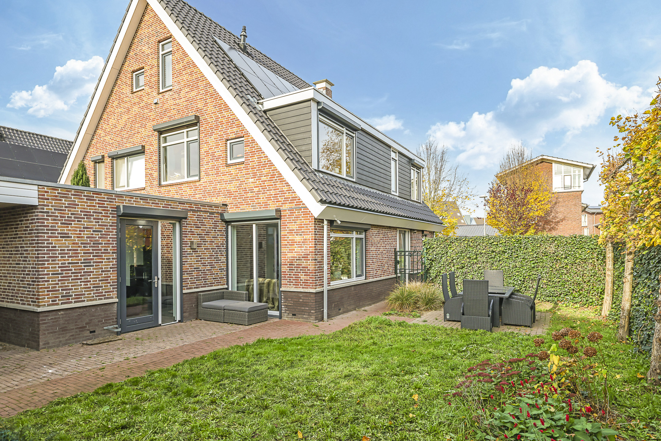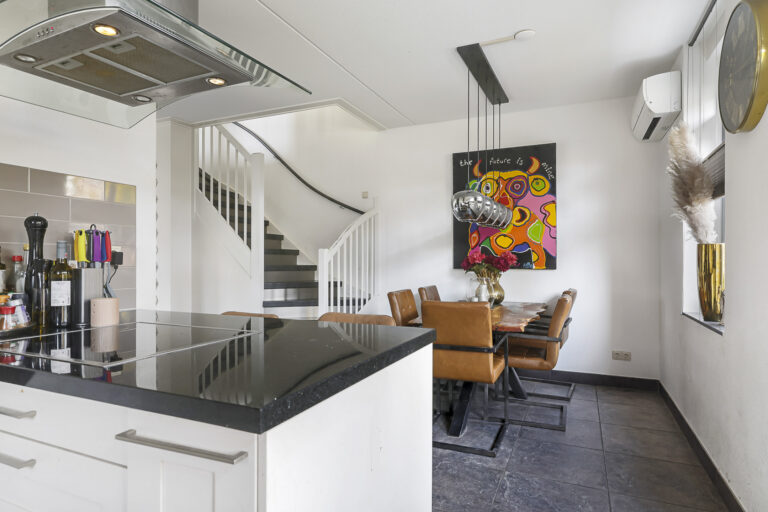 De woning voelt direct prettig aan: modern, licht en stijlvol afgewerkt. Op de begane grond ligt een fraaie plavuizenvloer met vloerverwarming. De open keuken met schiereiland is een echte blikvanger. Vanuit de woonkamer kijk je uit op de zonnige tuin – een heerlijke plek waar je tot in de avond buiten kunt zitten onder de overkapping.