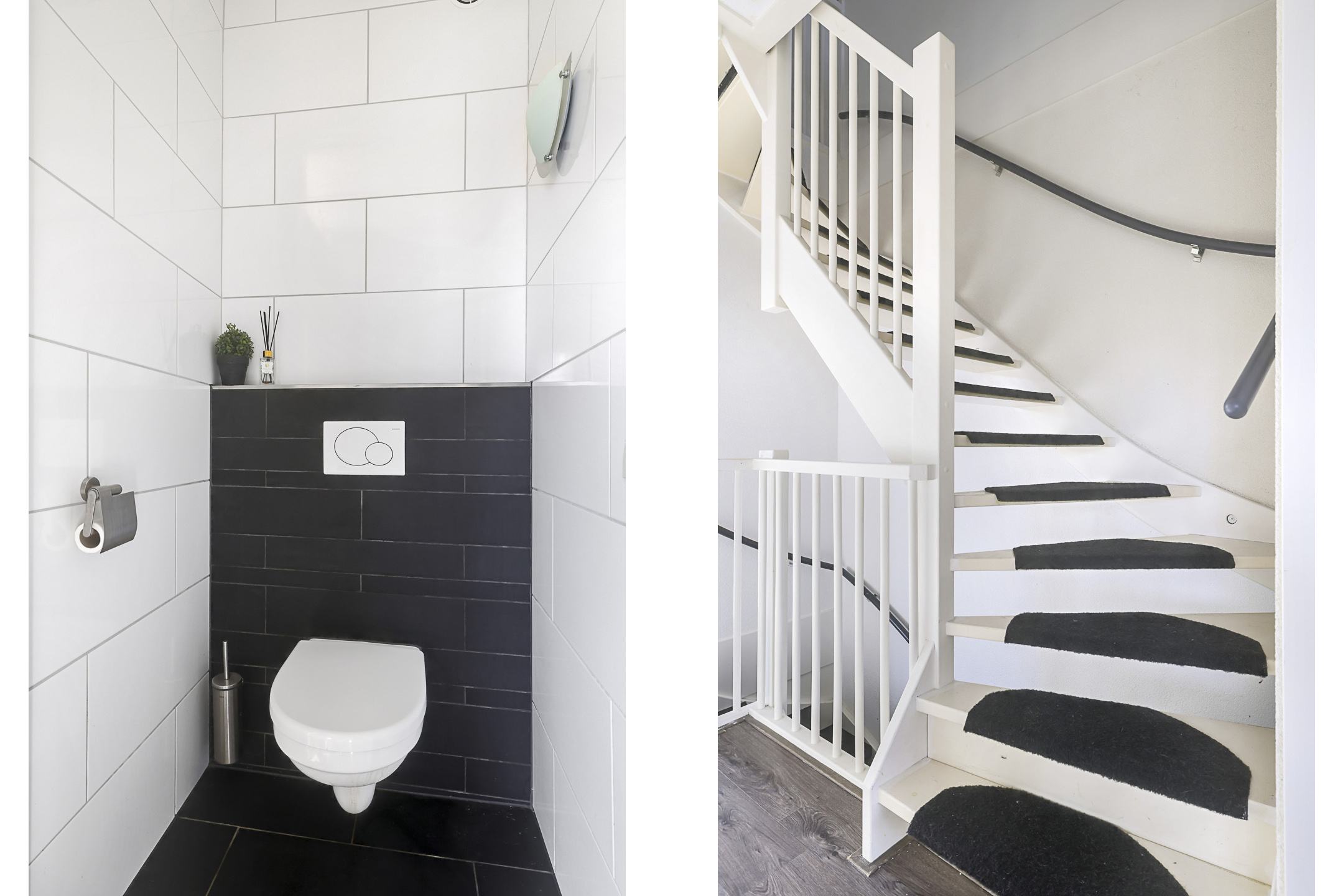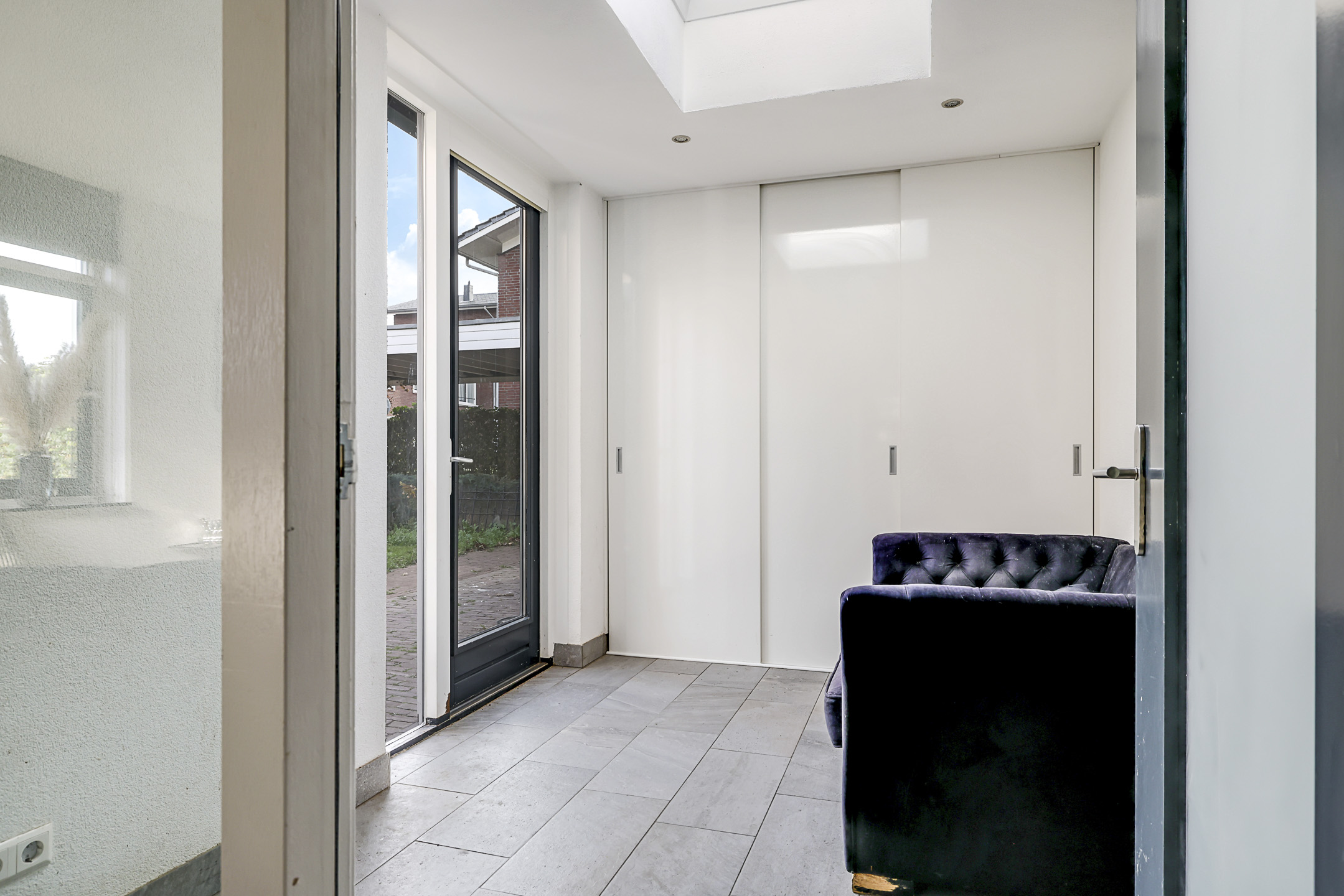 Entree met hal, meterkast en moderne toiletruimte. De open keuken beschikt over een moderne inbouwkeuken, uitgerust met diverse inbouwapparatuur, waaronder een koelkast, combimagnetron, Quooker (2021), vernieuwde vaatwasser (2022) en een kook(schier)eiland met barretje voorzien van een inductiekookplaat met afzuigschouw. Het geheel is afgewerkt met een duurzaam composieten werkblad. De open trap, voorzien van stijlvolle traprenovatie, dient tevens als roomdivider en houdt de woonkamer en keuken van elkaar gescheiden in een open leefruimte. De ruime woonkamer is tuingericht, voorzien van een praktische trapkast en biedt toegang tot de aangebouwde bijkeuken met achterentree, vaste kastenwand en wasbakje. In het dak is een lichtkoepel geplaatst zodat er voldoende daglicht aanwezig is.