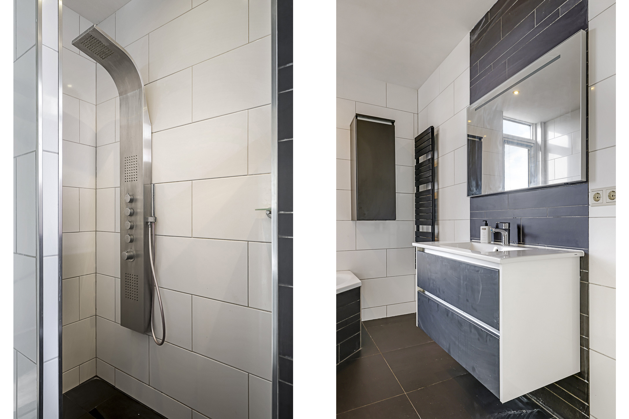 Overloop met drie slaapkamers, waarvan twee met elektrisch bedienbare rolluiken. De moderne badkamer is uitgevoerd in wit/antraciet en beschikt over een inloopdouche, ligbad, wastafelmeubel, designradiator en vloerverwarming. Het toilet is separaat geplaatst.