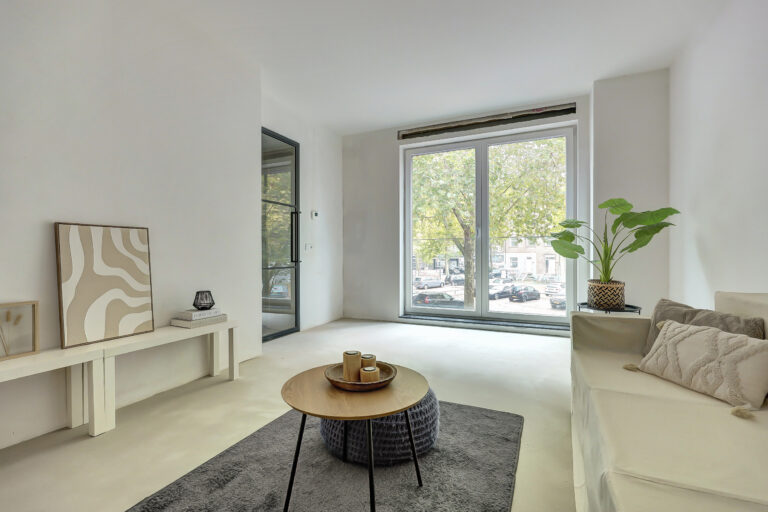 Op de eerste verdieping bevindt zich de ideale ruimte voor de woonkamer. Een aangenaam lichte ruimte dankzij de hoge plafonds en het Franse balkon aan de achterzijde. Tevens is er op deze verdieping een luxe separaat toilet aanwezig.