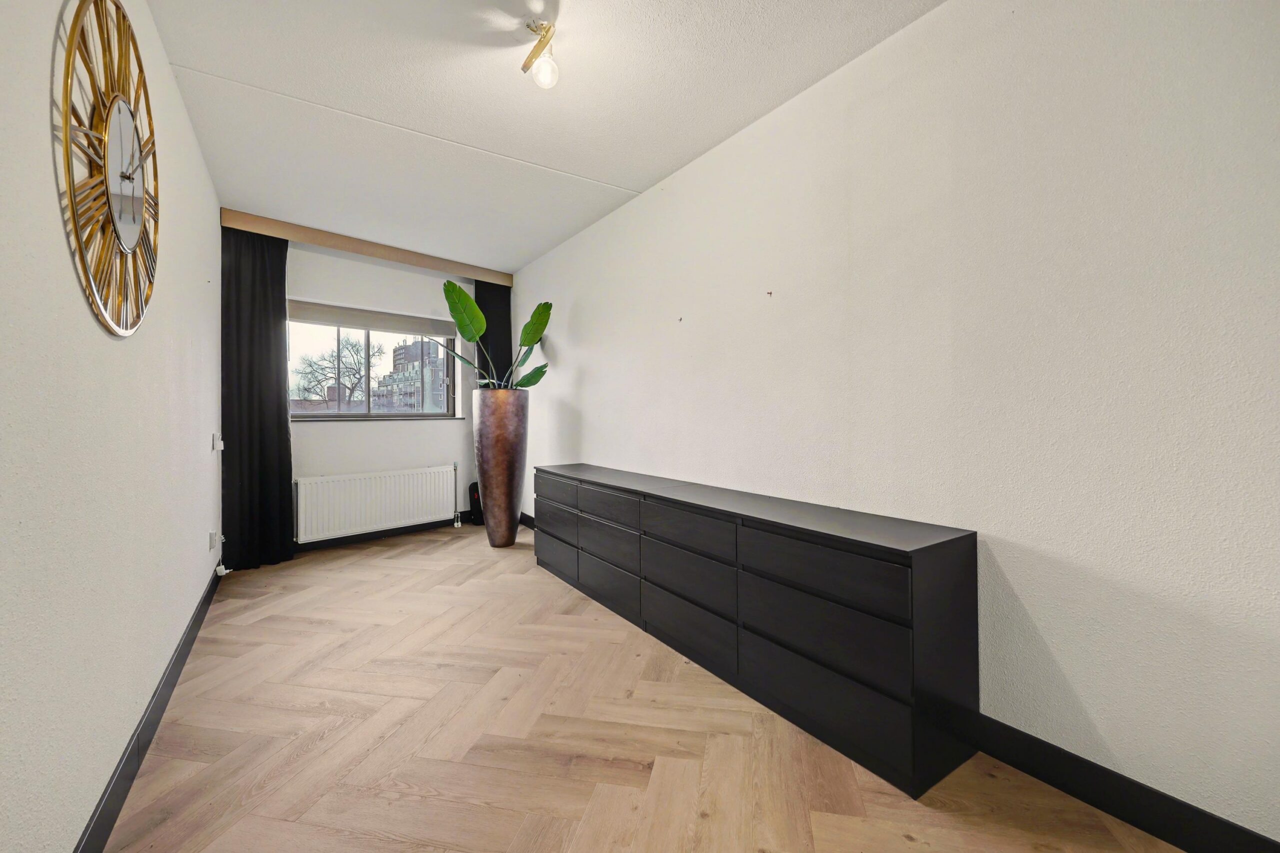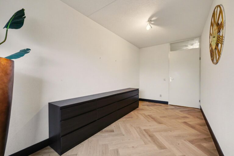 Op de vijfde verdieping kom je via de hal het recentelijk gerenoveerde appartement binnen. De hal geeft toegang tot verschillende vertrekken zoals het separate toilet, de berging, de badkamer en de woonkamer. De woonkamer is ruim opgezet en valt direct op door de grote raampartijen en fijne lichtinval. De schuifpui zorgt voor een open verbinding met het balkon en versterkt het gevoel van ruimte. De open keuken sluit hier naadloos op aan en is praktisch ingericht, waardoor koken en wonen moeiteloos samengaan. De nis aan de achterzijde van de woonkamer geeft je de mogelijkheid om een extra kamer of werkruimte te creëren. Vanuit de hal zijn tevens de twee slaapkamers bereikbaar, evenals de luxe badkamer die compleet is uitgevoerd met inloopdouche, toilet en een dubbele wastafel.