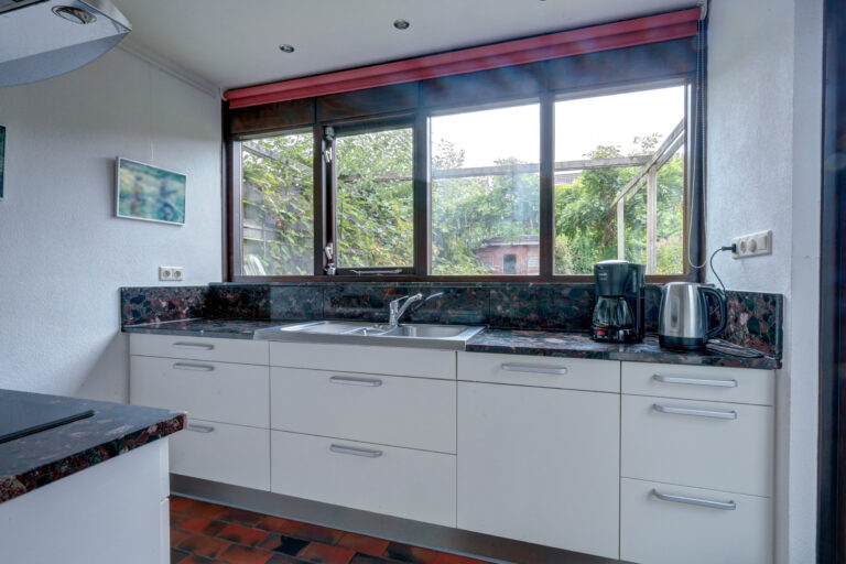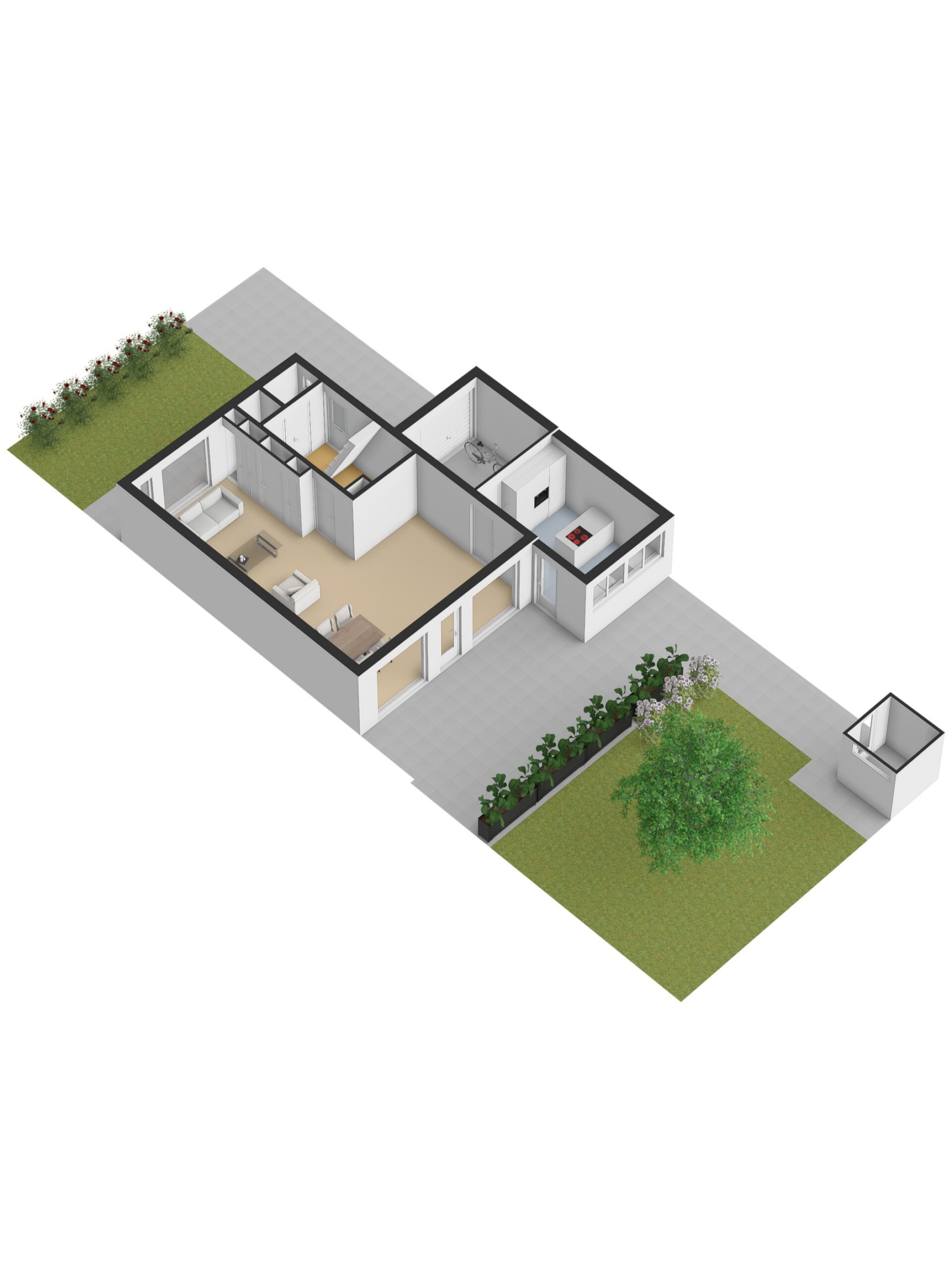 Entree/hal, toiletruimte met toilet en fonteintje, trapopgang, inbouwkast, meterkast; royale L-vormige woonkamer met doorloop naar de dichte keuken met toegang tot tuin en inpandige berging. Deze bergruimte is nu in gebruik als verwarmde bijkeuken en gemakkelijk uit te bouwen tot bijvoorbeeld kantoorruimte.