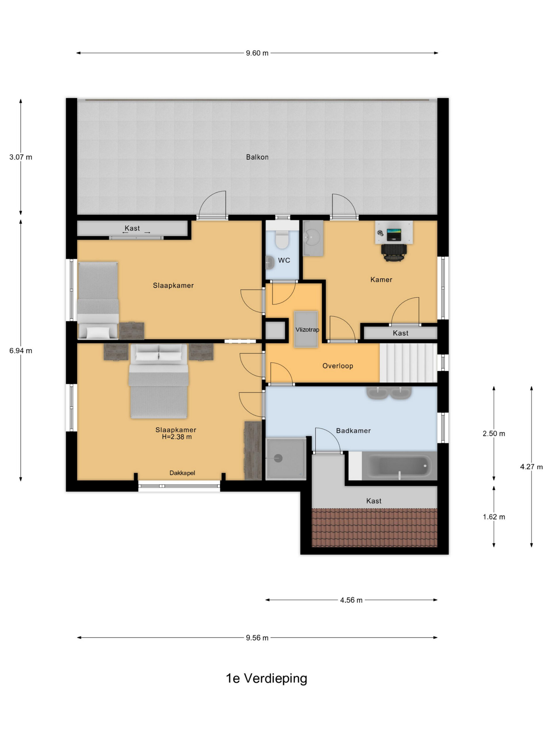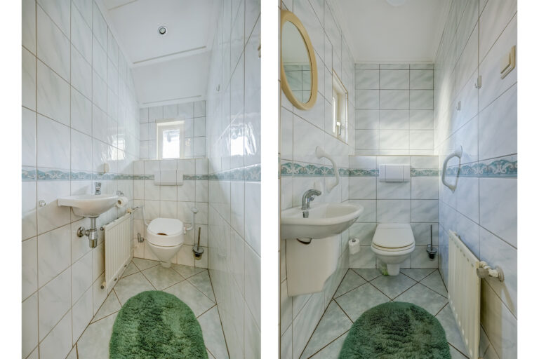 Op de eerste verdieping biedt de overloop toegang tot drie ruime slaapkamers en een separaat toilet. De riante badkamer is voorzien van een ligbad, douche en dubbele wastafel, uitgevoerd in een tijdloze stijl. Extra bergruimte zorgt voor een opgeruimde en praktische verdieping.