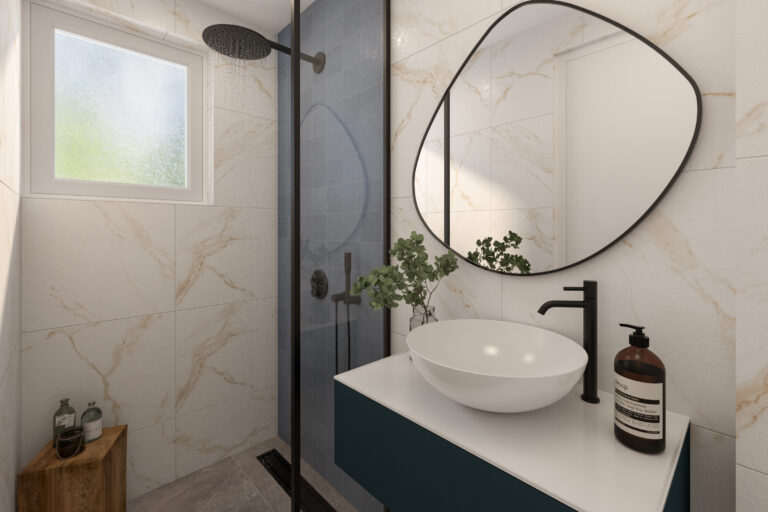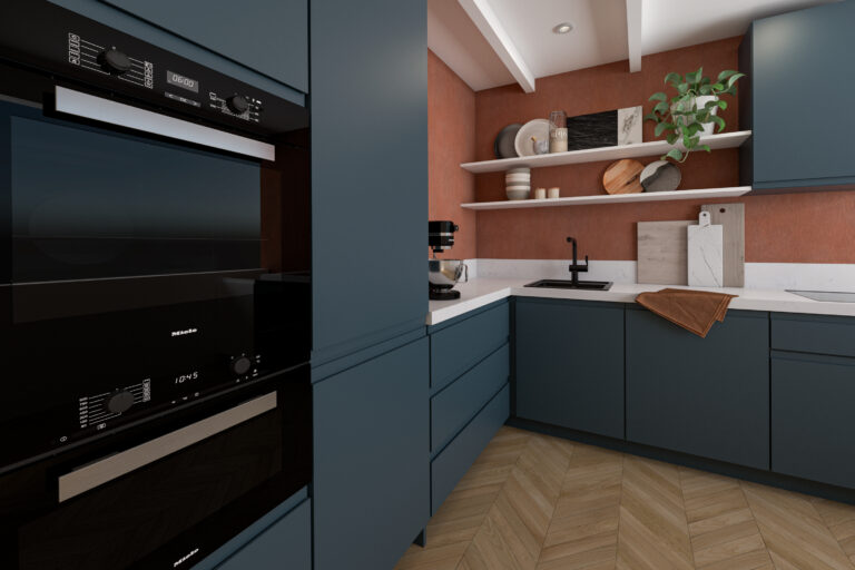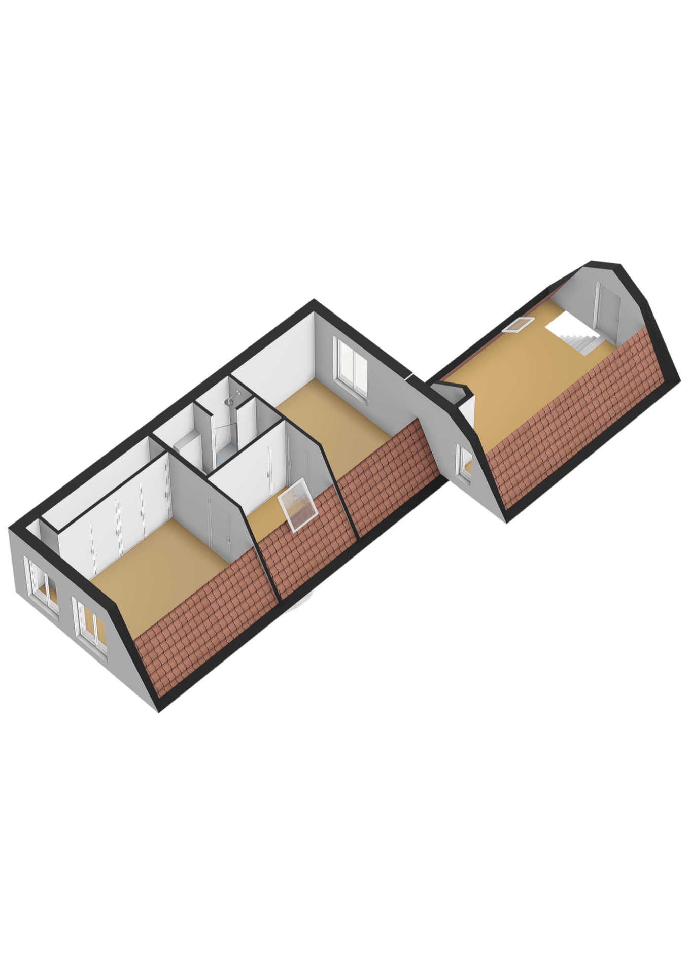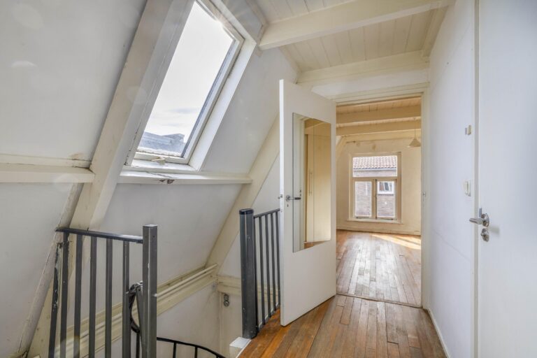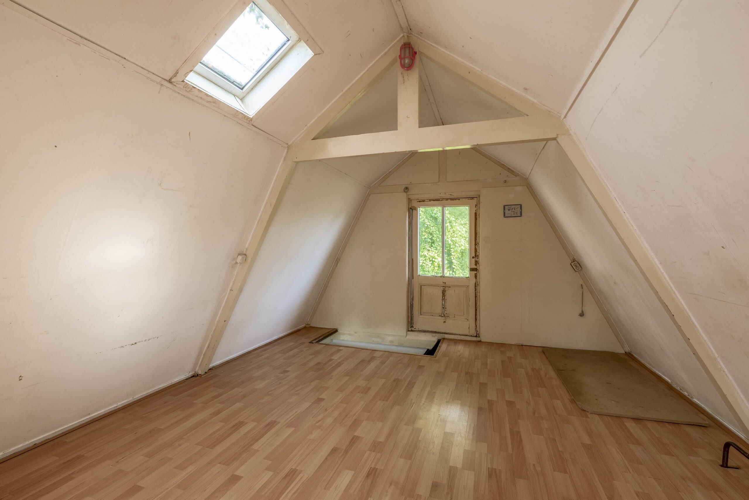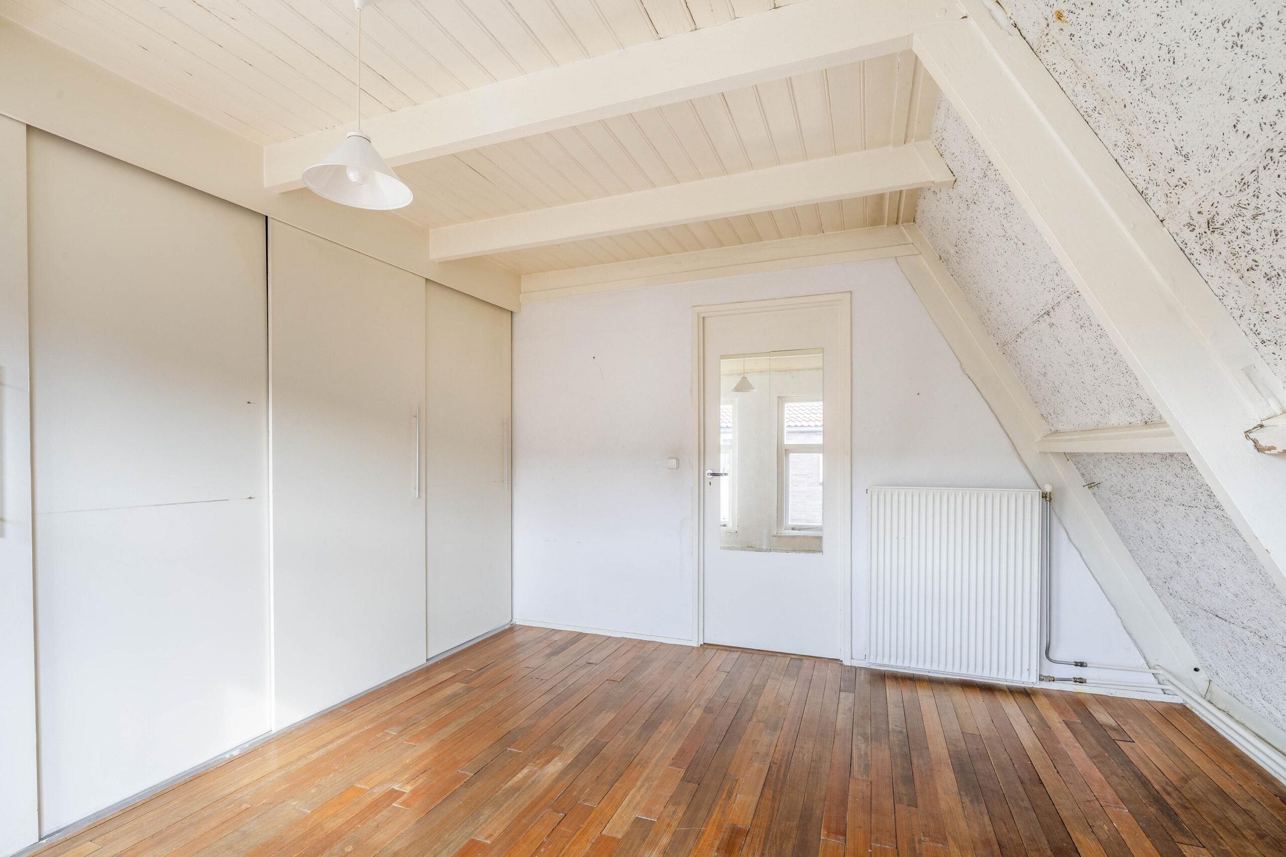 Op de verdieping bevinden zich twee slaapkamers. Beide kamers profiteren van het karakteristieke dak met speelse vormen en ramen die zorgen voor voldoende lichtinval. Op deze verdieping is bovendien een badkamer aanwezig, voorzien van een wastafels en een tweede toilet. De overloop verbindt de kamers op natuurlijke wijze en biedt een aangename doorloop. Boven de keuken is er nog een royale derde kamer.