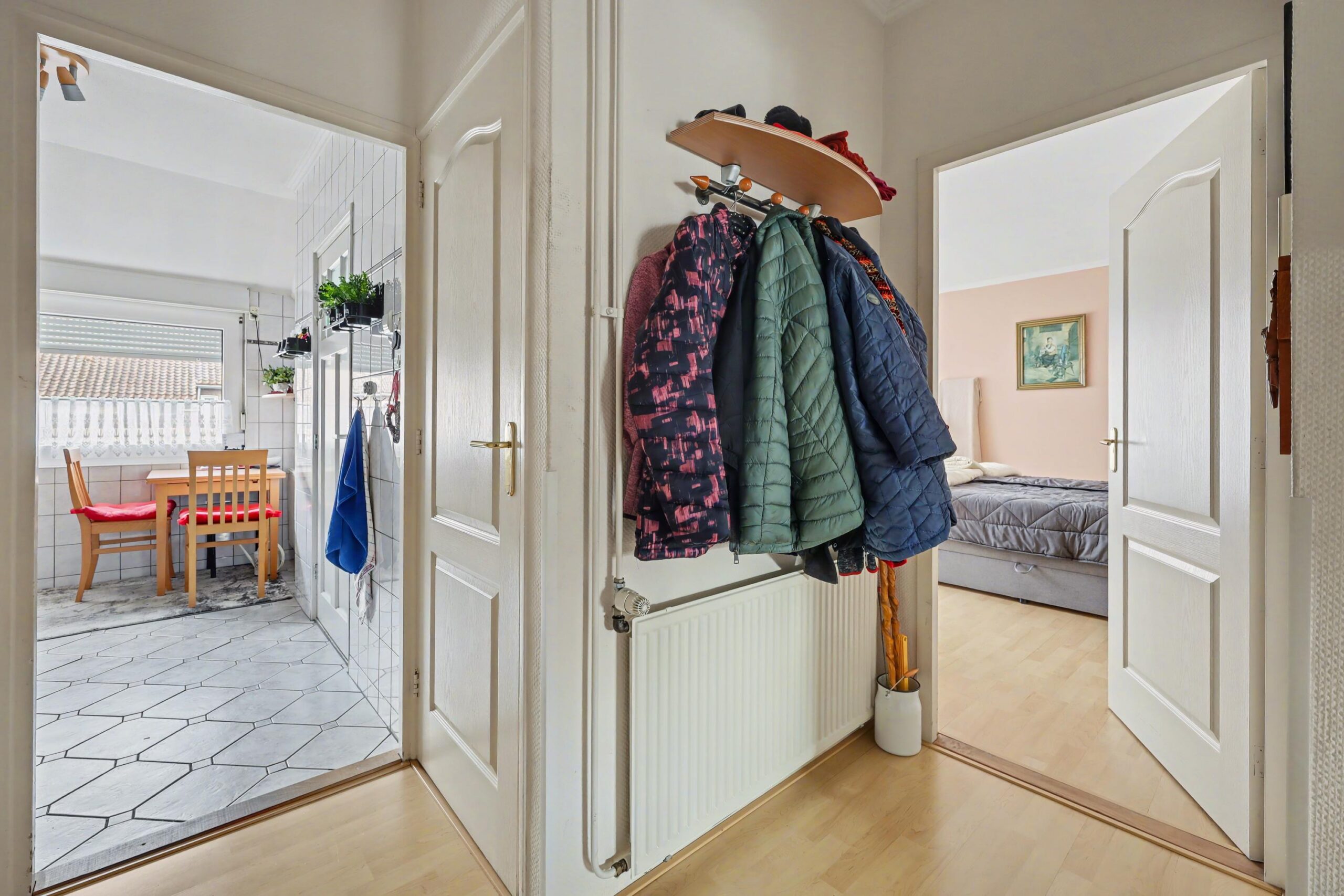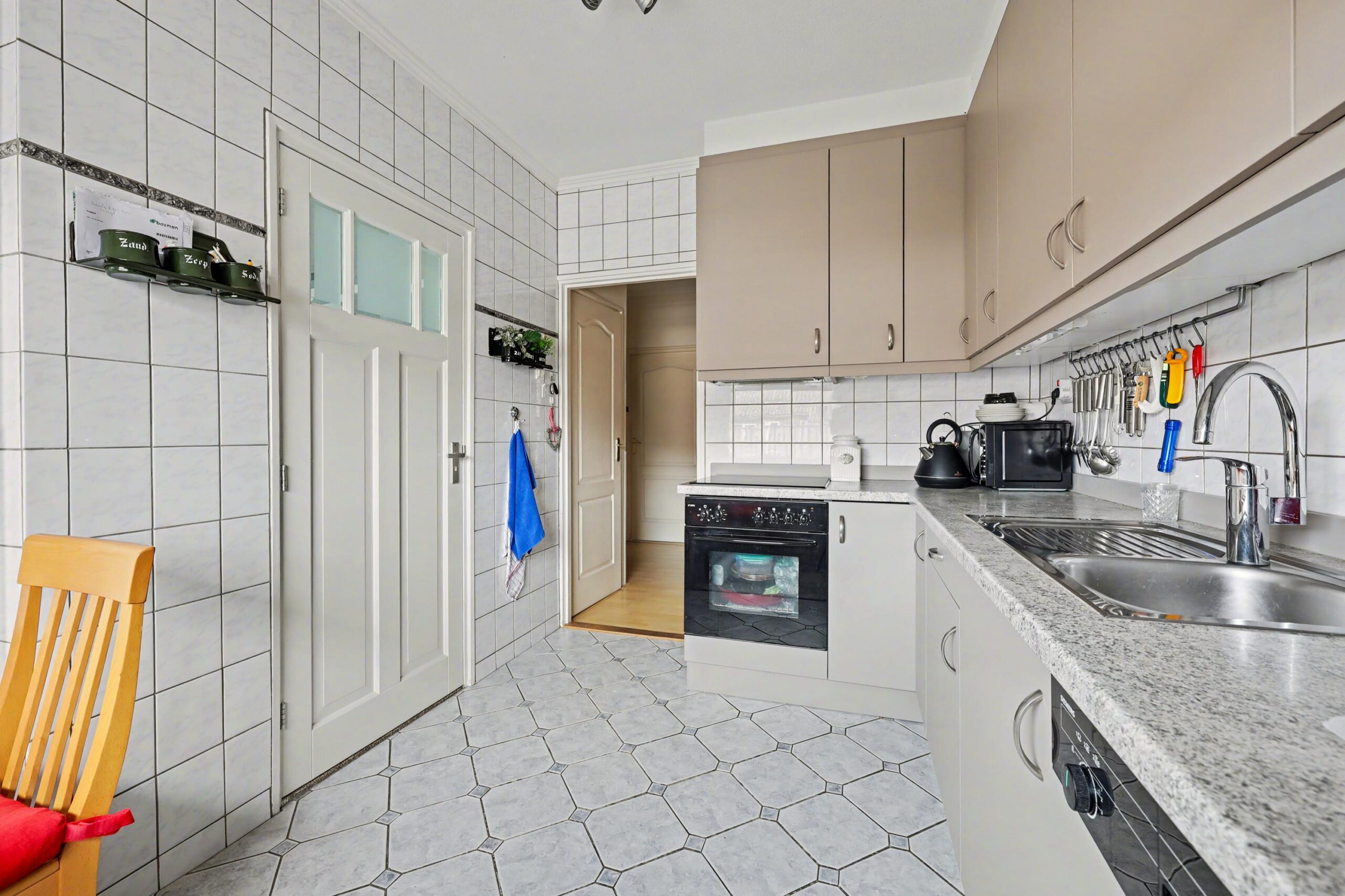 Via de hal zijn de verschillende vertrekken bereikbaar. De lichte en ruime woonkamer vormt het hart van het appartement en biedt voldoende ruimte voor zowel een comfortabele zithoek als een eethoek. De keuken is praktisch ingericht en beschikt over de benodigde aansluitingen en bergruimte.
