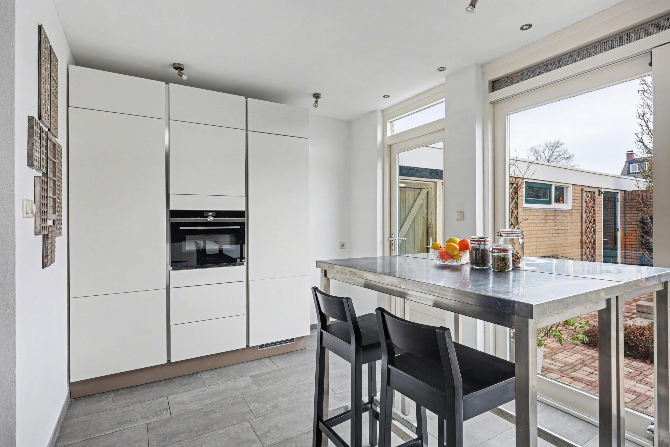De entree en hal geven toegang tot het toilet, de trapopgang en de leefruimtes. De woonkamer is licht en prettig van opzet en staat in directe verbinding met de achtertuin via een schuifpui, wat zorgt voor een mooie relatie tussen binnen en buiten. De keuken is praktisch ingericht en vormt een functioneel geheel met de woonkamer. Deze is voorzien van diverse inbouwapparatuur, waaronder een kookplaat, oven en afzuigvoorziening, waardoor koken hier comfortabel is. De opstelling biedt voldoende werk- en bergruimte en sluit goed aan bij het dagelijkse gebruik.