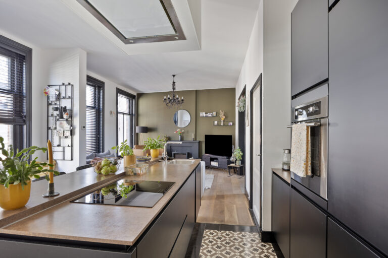 De eerste verdieping blinkt uit in stijl en functionaliteit. De overloop biedt toegang tot een royale, lichte woonkeuken met een luxe kookeiland en moderne inbouwapparatuur. Perfect voor wie van koken houdt of gezellig samenkomt. De aangrenzende loungekamer en aparte eetkamer zorgen voor een speelse indeling, waarbij iedere ruimte zijn eigen sfeer heeft. Daarnaast geven openslaande deuren vanuit de eetkamer toegang tot een heerlijk dakterras van 16m². Dit is de ideale plek om van de zon te genieten, of het nu in alle rust is of met vrienden.