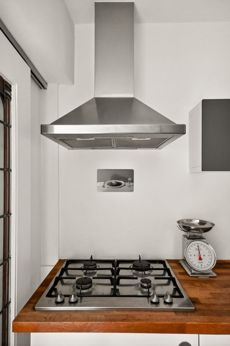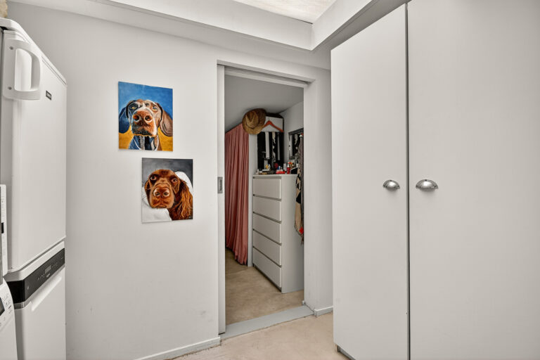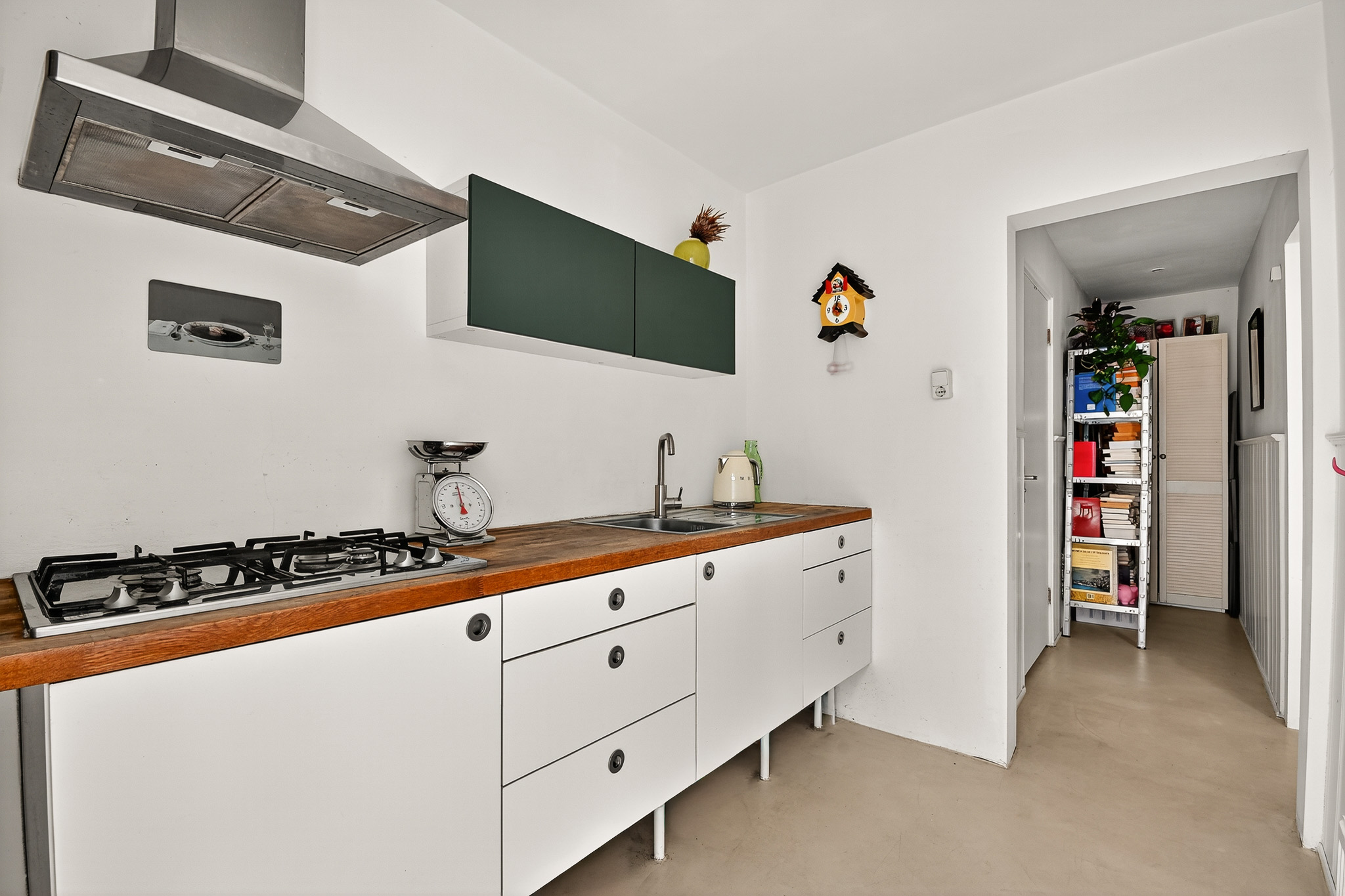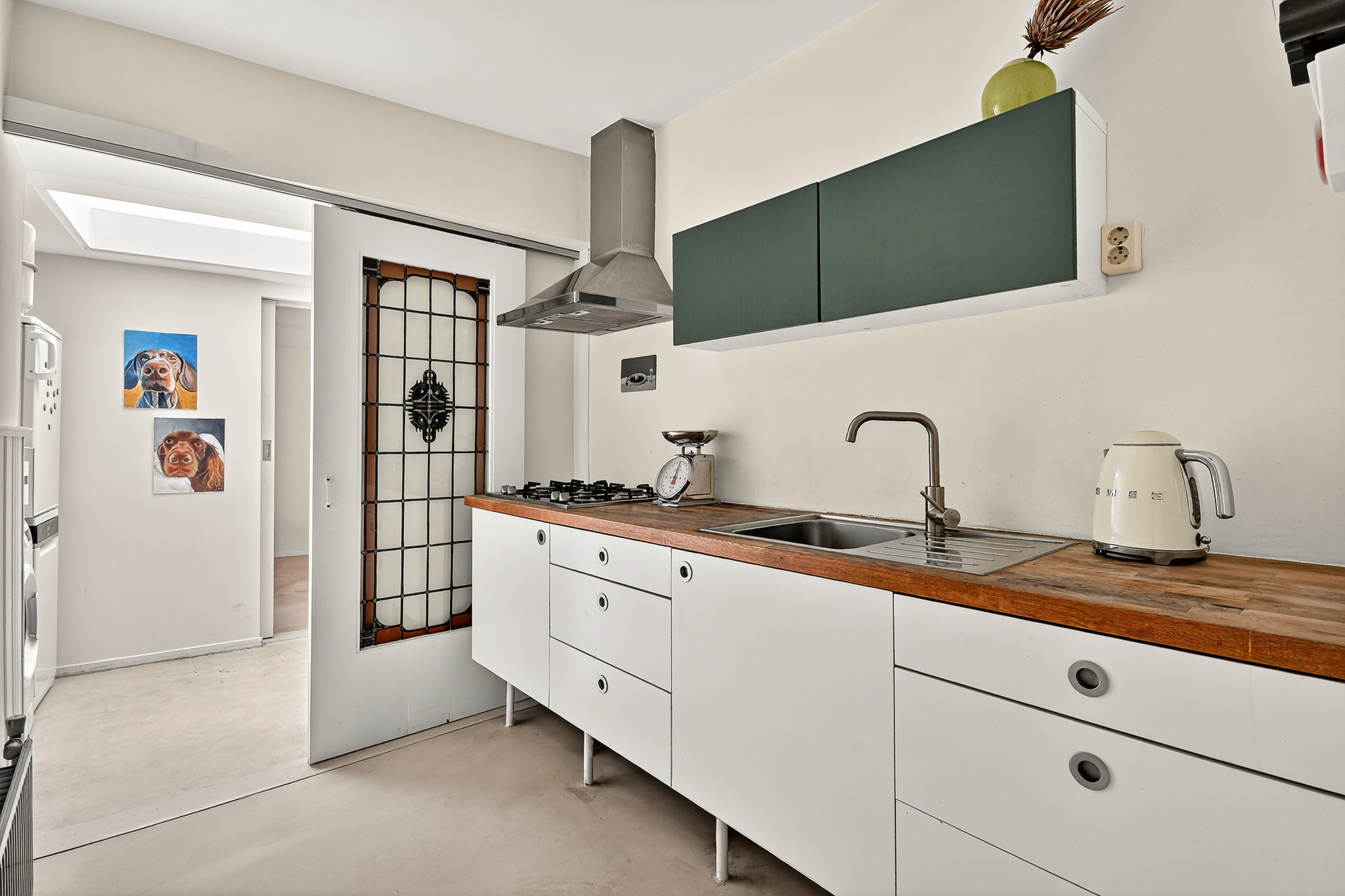 De dichte keuken is netjes en praktisch ingericht met een 4-pits gasfornuis en afzuigkap. In de aangrenzende bijkeuken met dakraam vind je de wasmachine-/drogeropstelling, de vaatwasser, de koel- vriescombinatie en de CV-ketel.