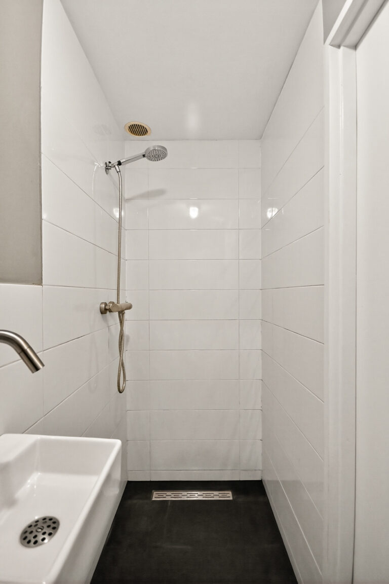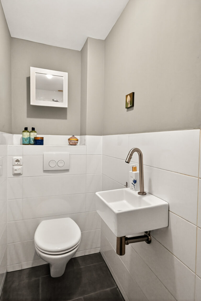 De badkamer is compact maar functioneel, voorzien van een douche, toilet, wastafel en vloerverwarming.