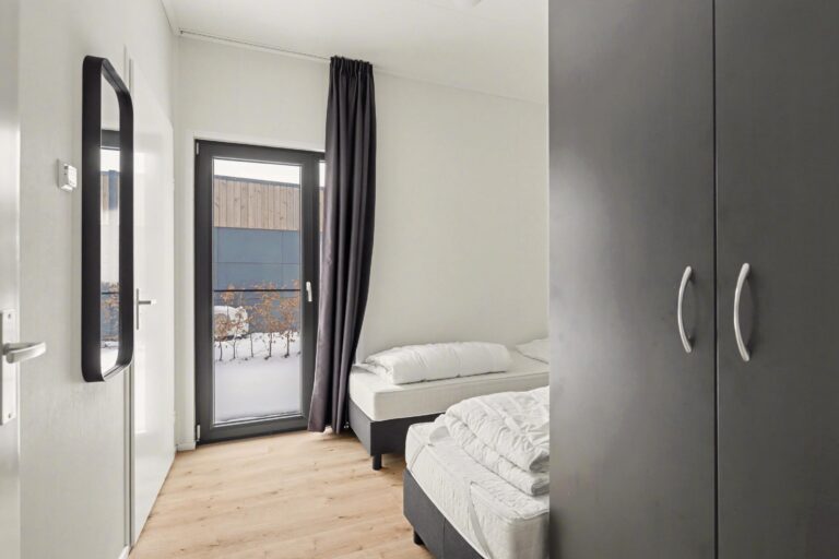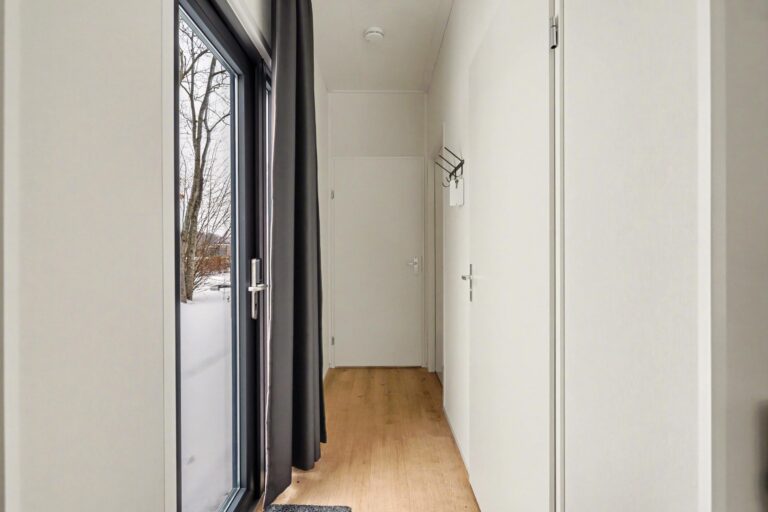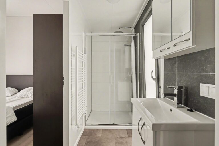 De doordacht ingedeelde bungalow heeft een royale woonkamer met grote glaspartijen waardoor er veel licht binnenvalt. De moderne keuken is van alle gemakken voorzien. De bungalow beschikt over twee slaapkamers die beide rechtstreeks toegang hebben tot de nette badkamer. De badkamer is uitgerust met een douche en een wastafel. Er is een apart toilet. Buiten kunt u genieten op uw eigen terras.