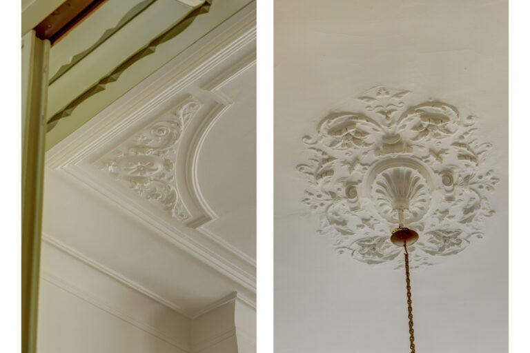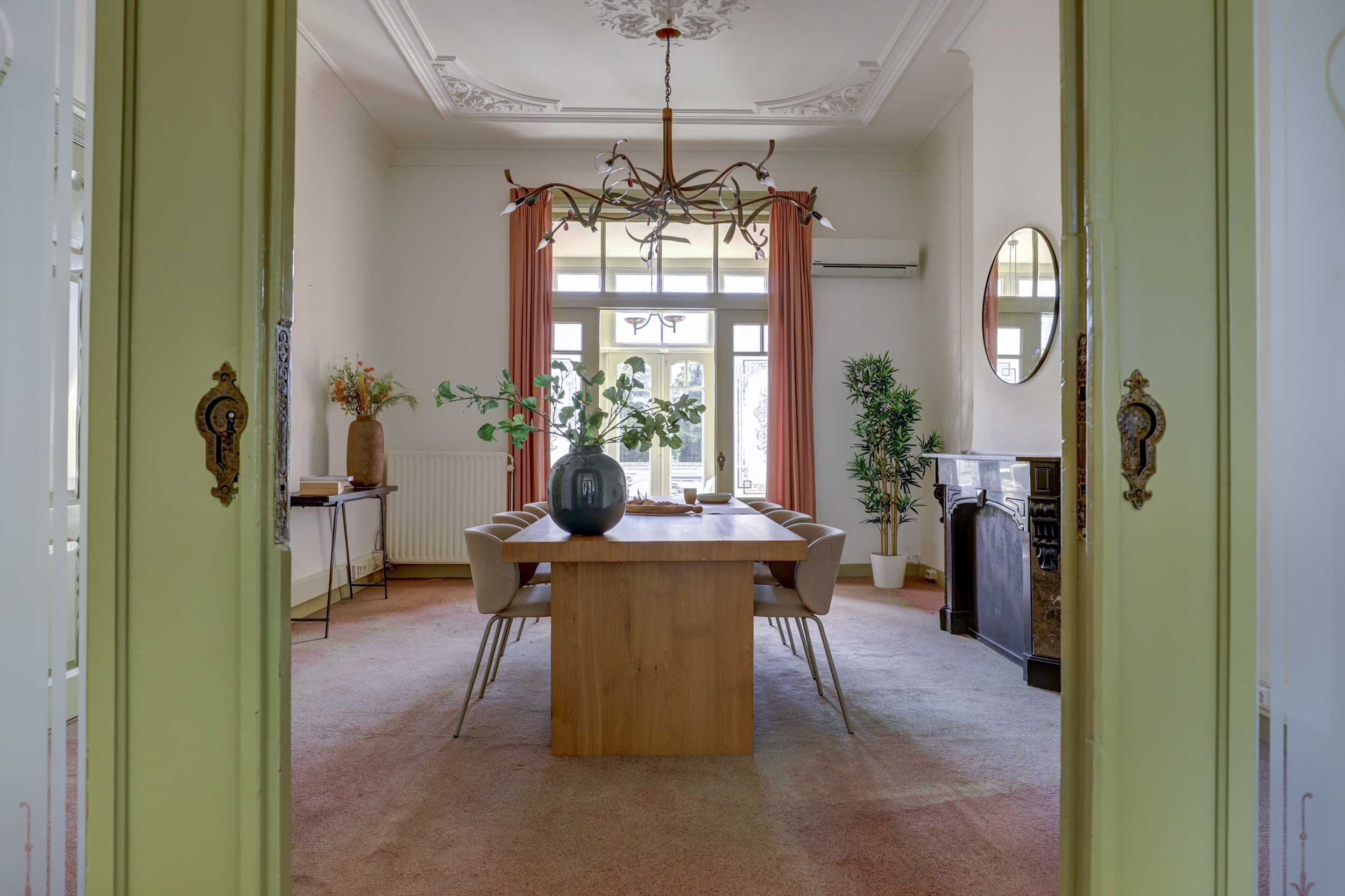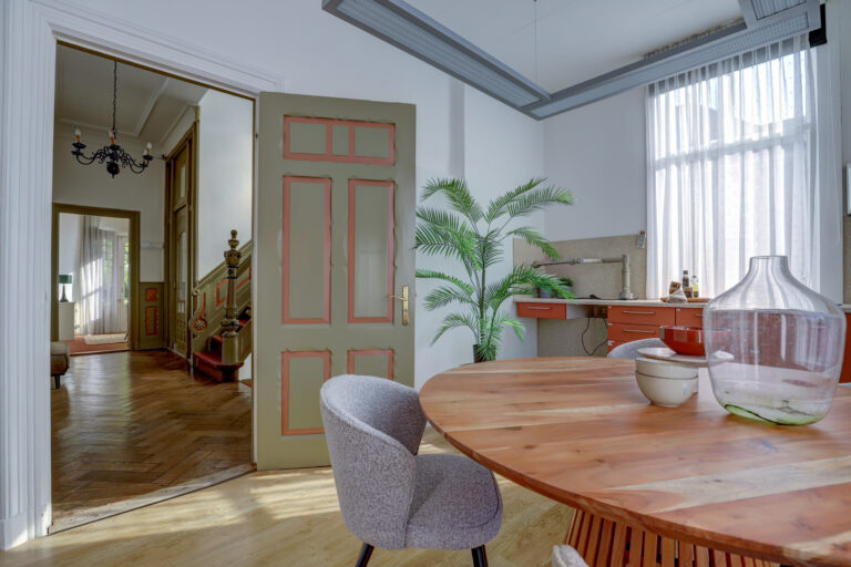 Via het smeedijzeren hek en de stenen buitentrap stap je binnen op de bel-etage. In de hal voel je direct de sfeer van het huis: hoge plafonds, glas-in-lood, houten vloeren, originele schouwen, een serre. De woonkamer en eetkamer zijn met en suite-deuren van elkaar gescheiden – perfect voor lange avonden met vrienden of juist knusse middagen met het gezin. Op deze verdieping zijn nog twee extra kamers, bijvoorbeeld als speelruimte of thuiskantoor. De bel-etage is jarenlang als kantoorruimte gebruikt, maar je ziet meteen hoe eenvoudig het weer een volwaardige leefverdieping wordt. Alles klopt hier.